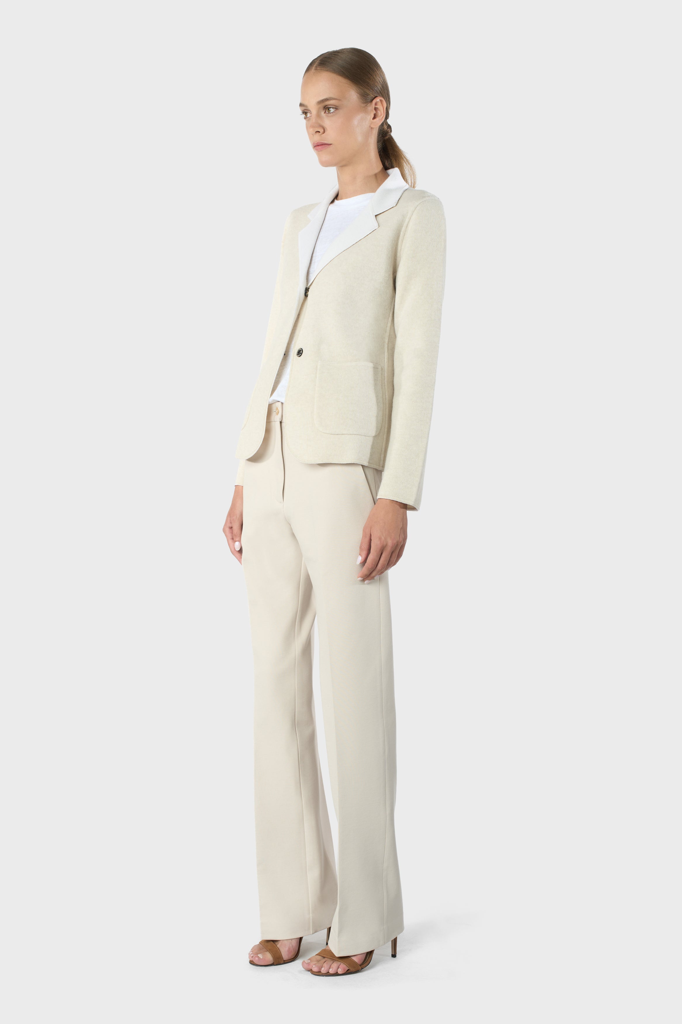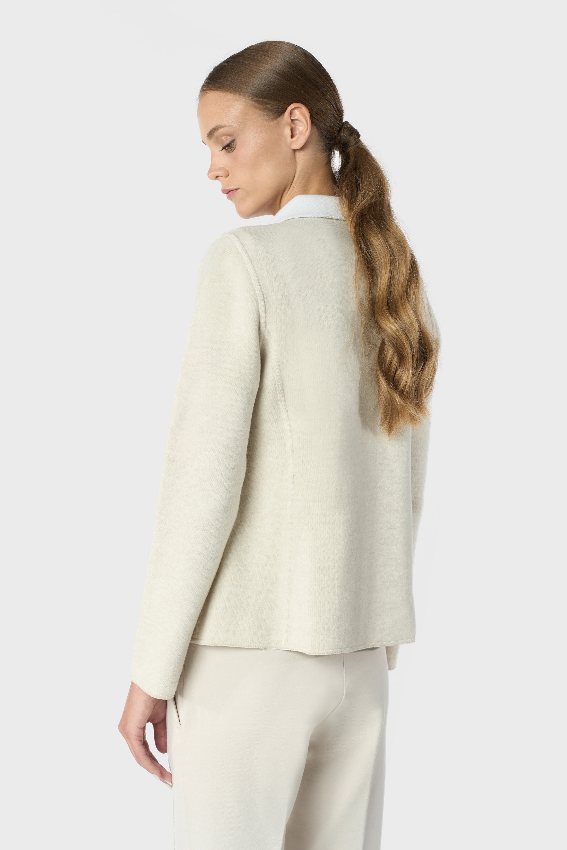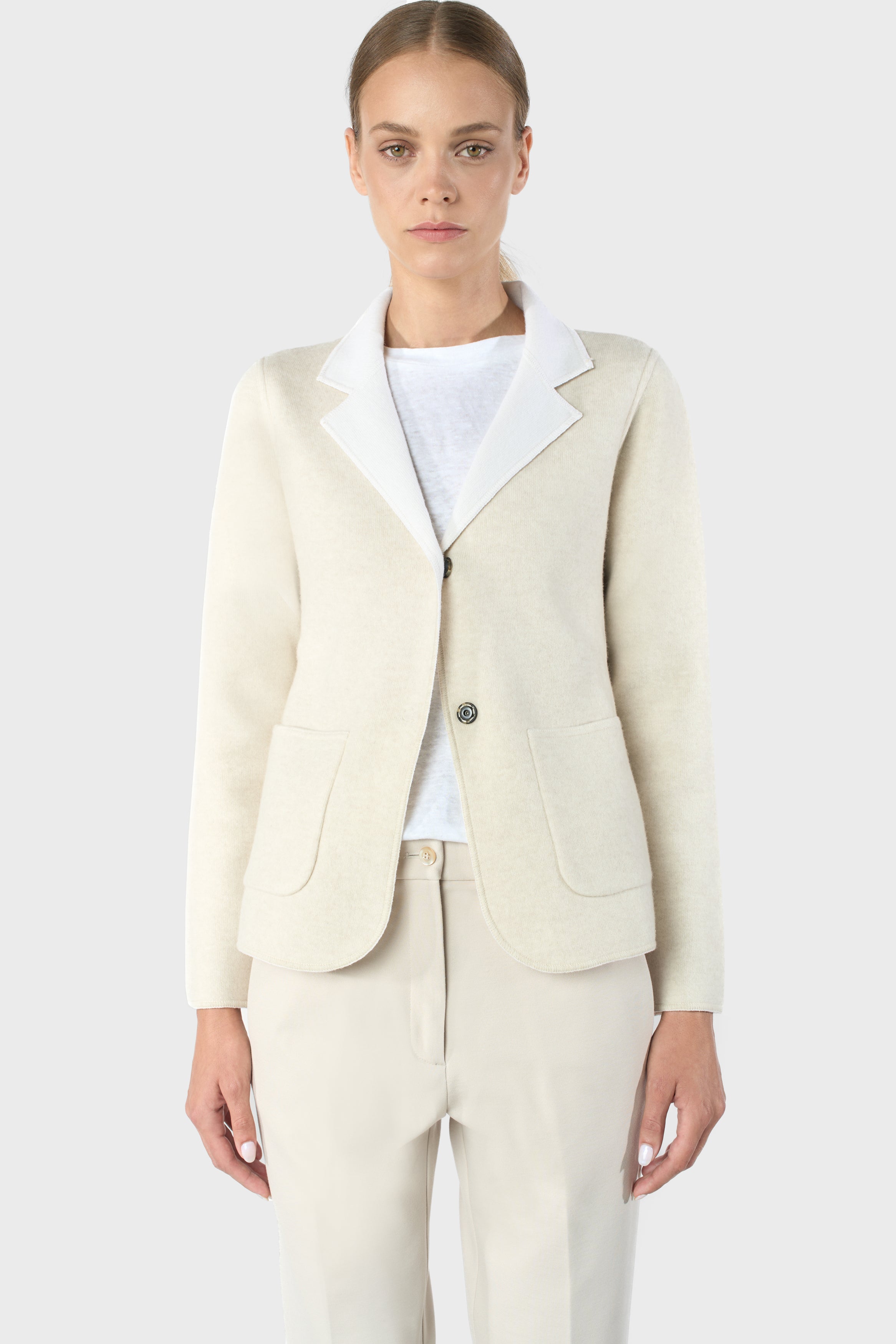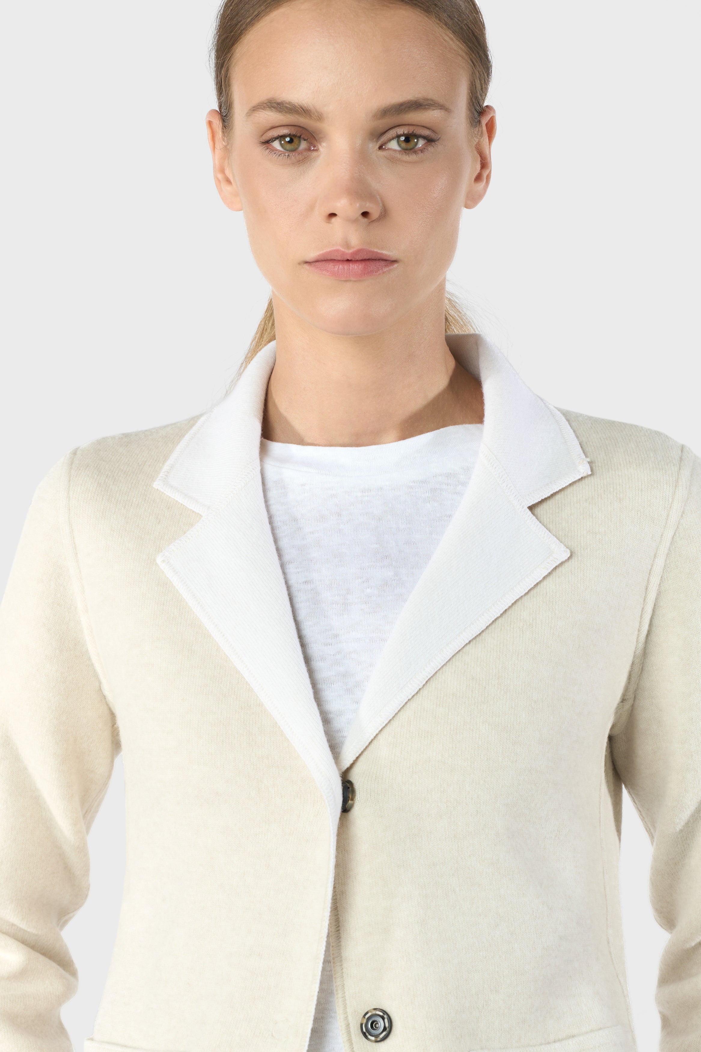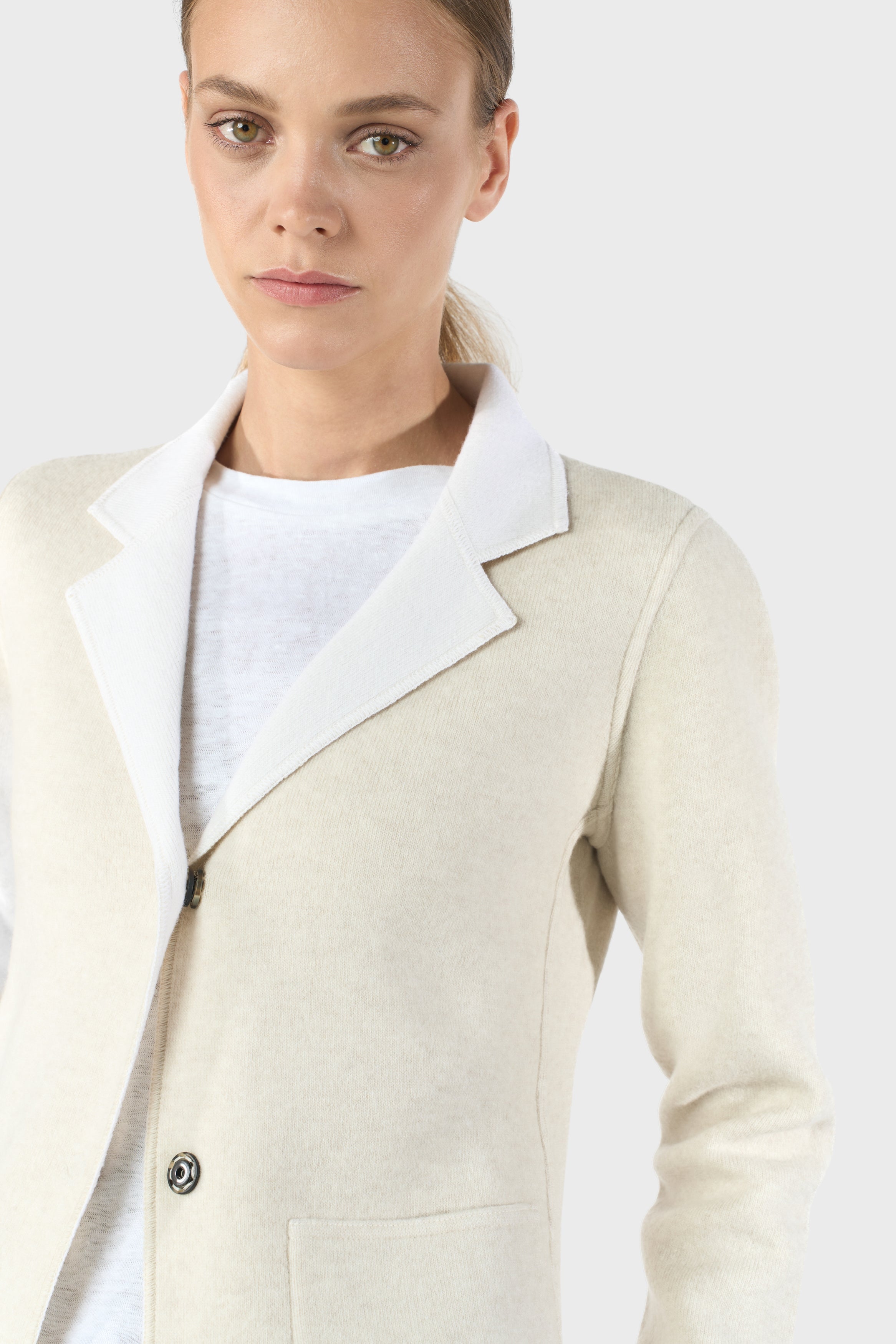 Blazer col rever di maglia di soffice lana, bicolore, bottoni automatici, due tasche.