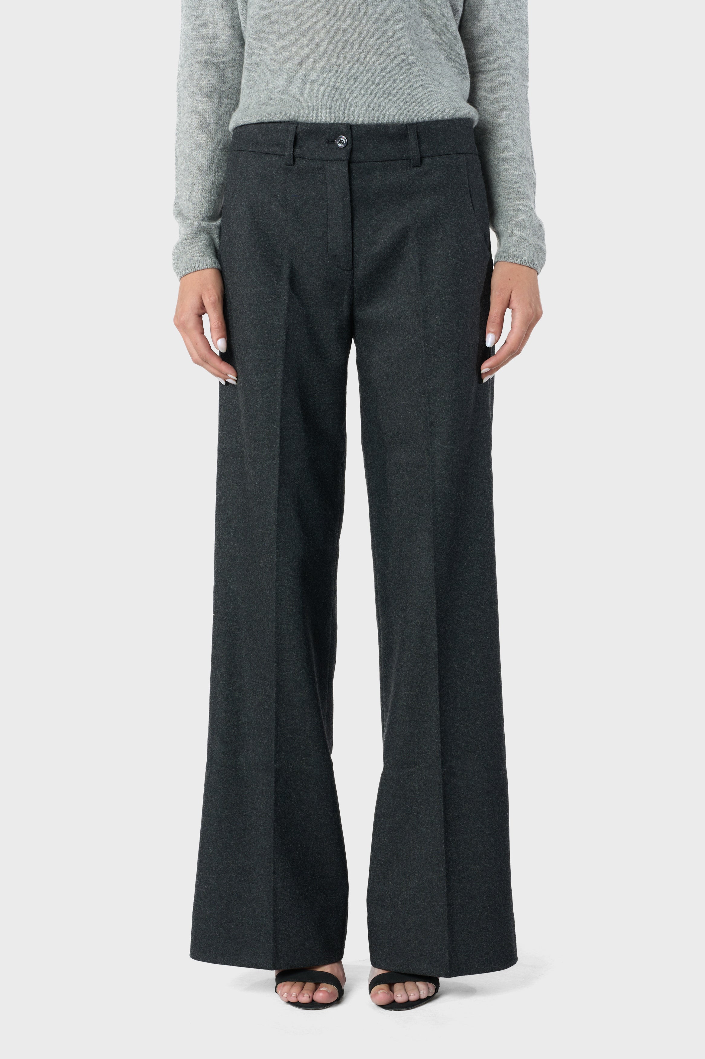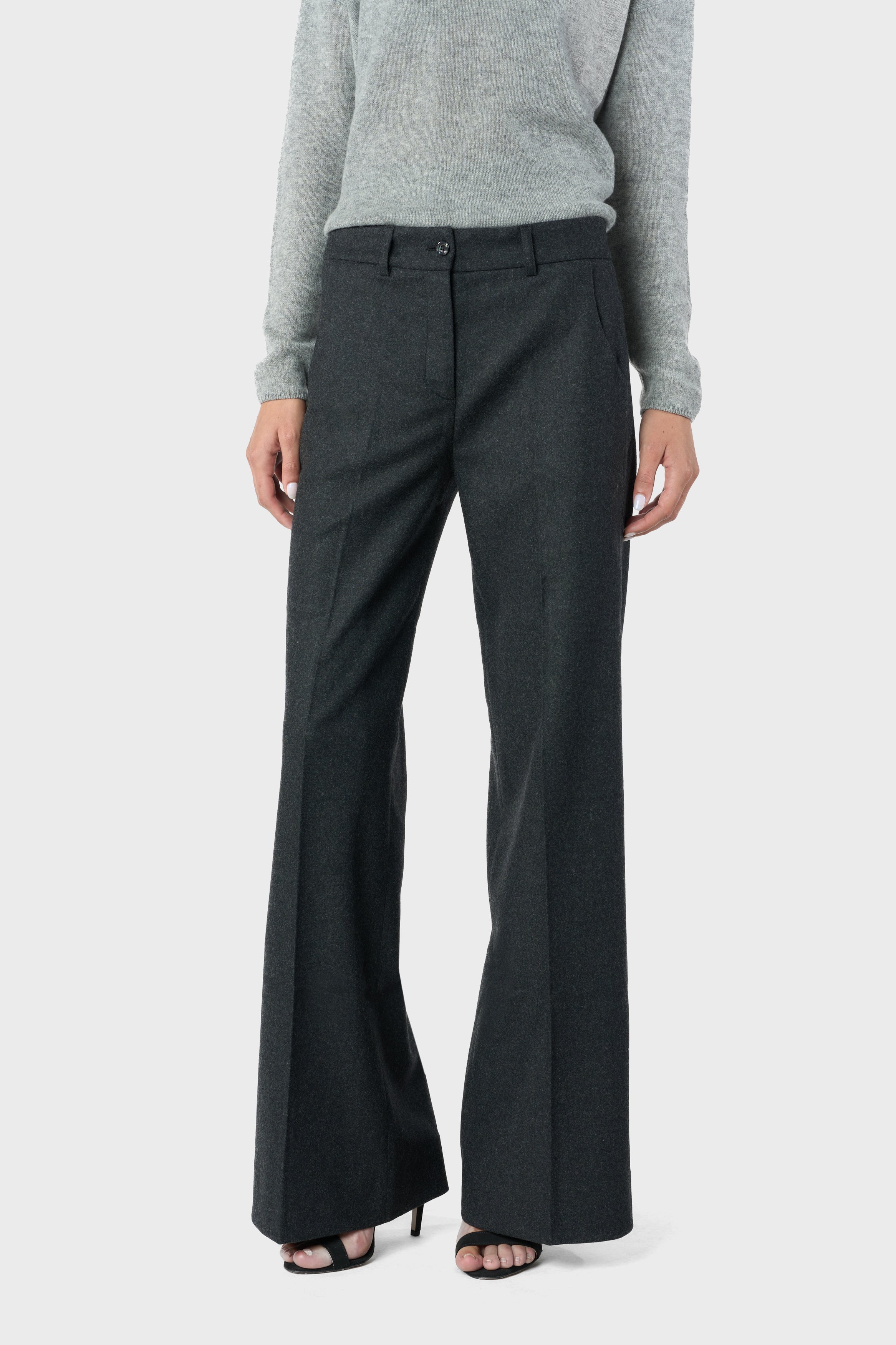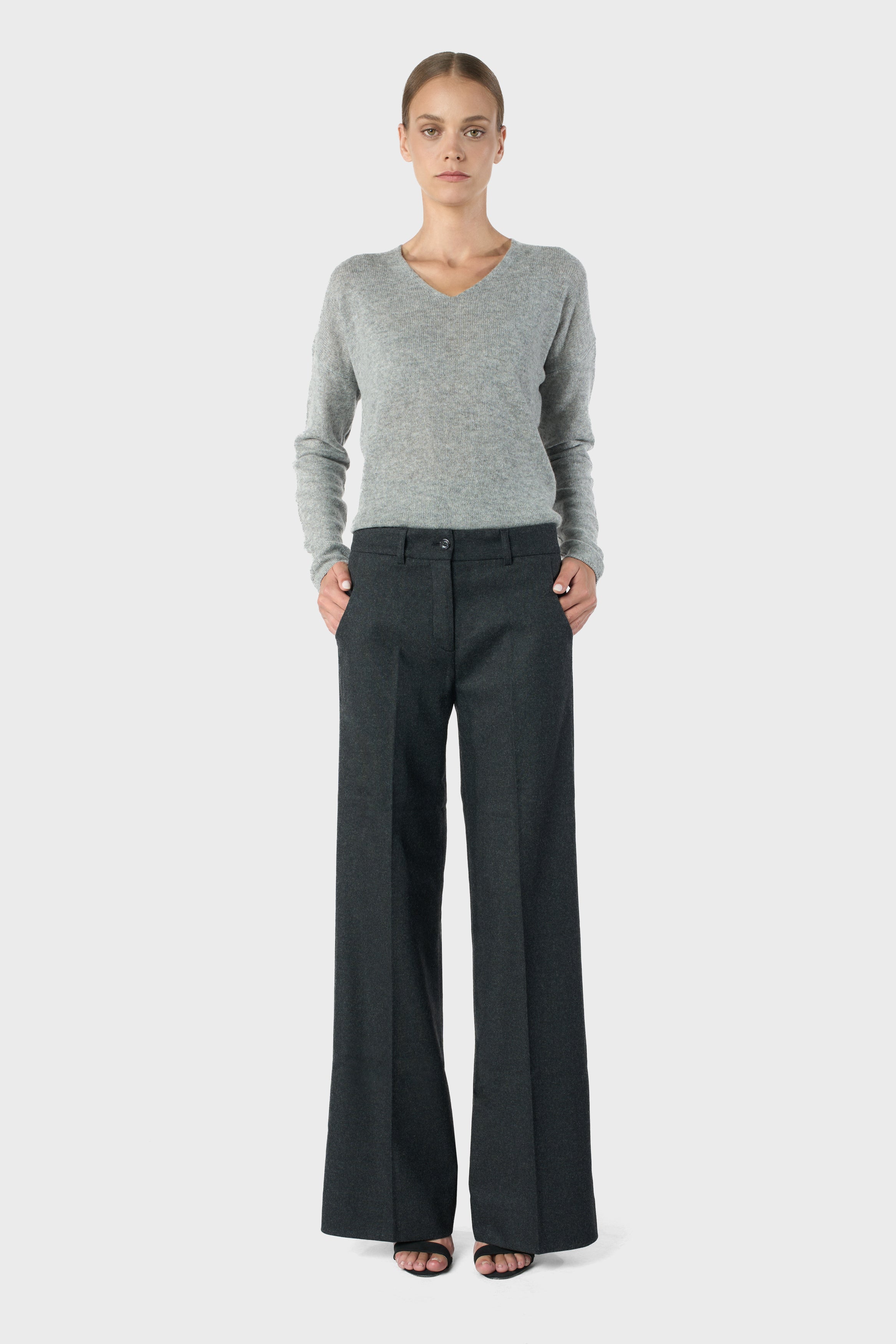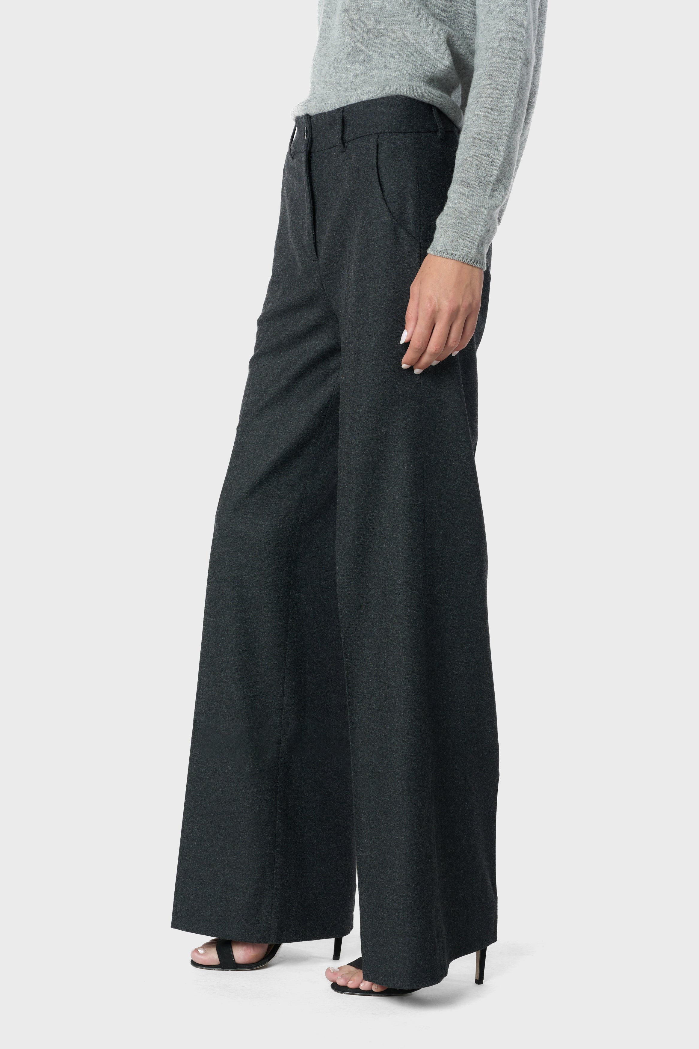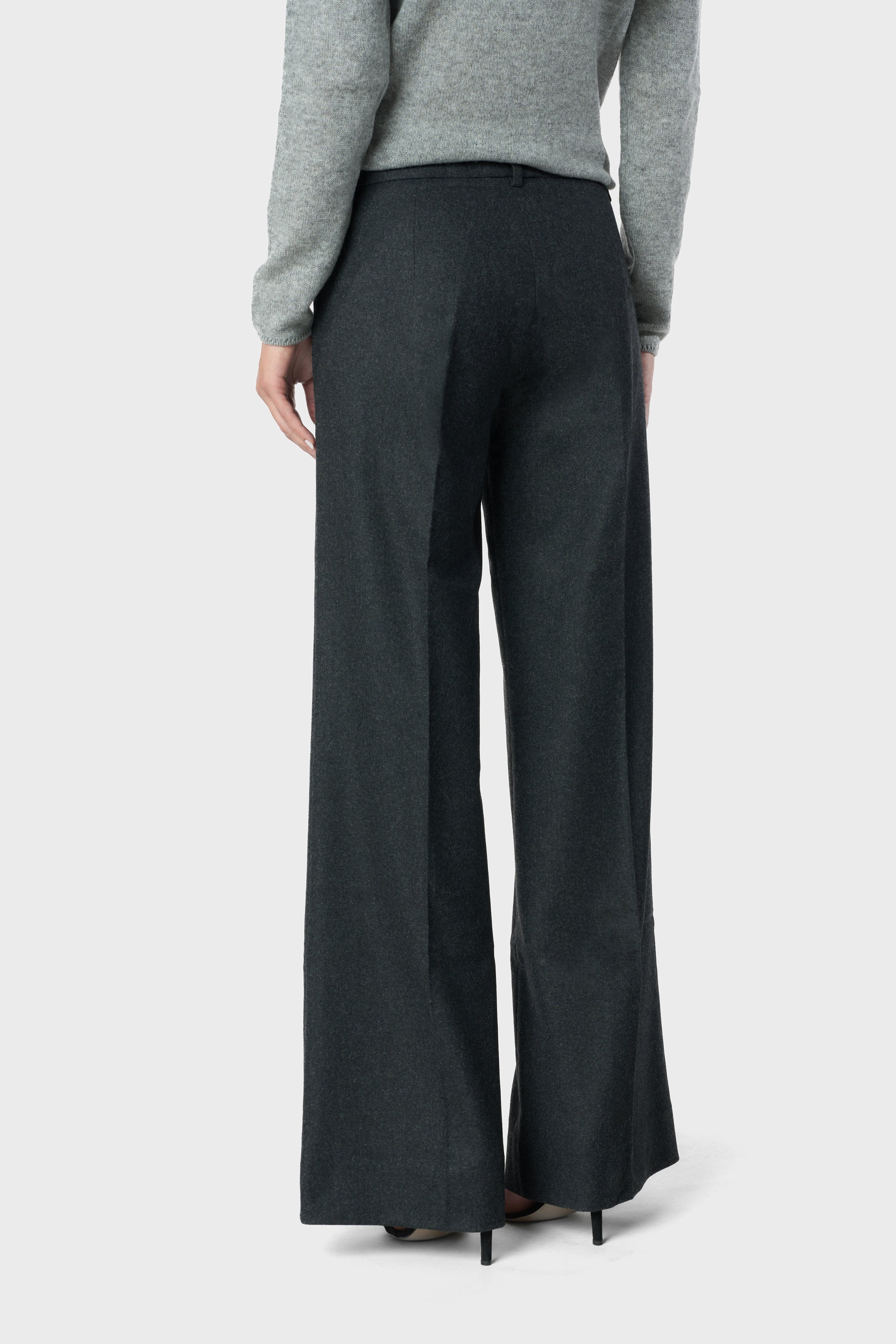Pantaloni di tessuto di lana, leggermente stretch, vita alta, gamba larga e dritta.