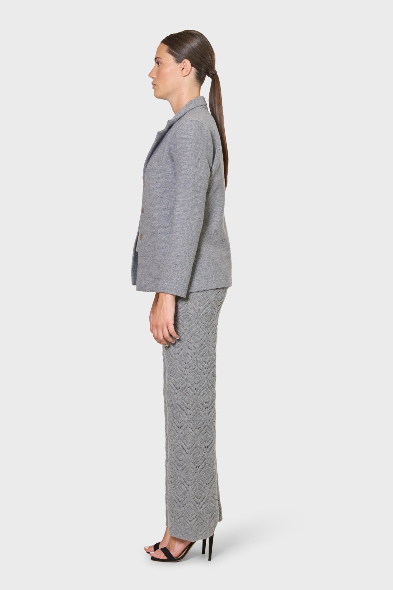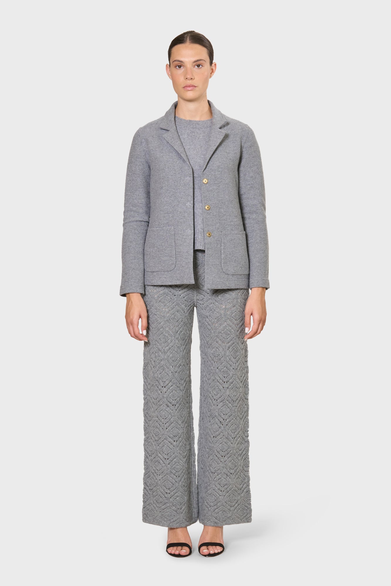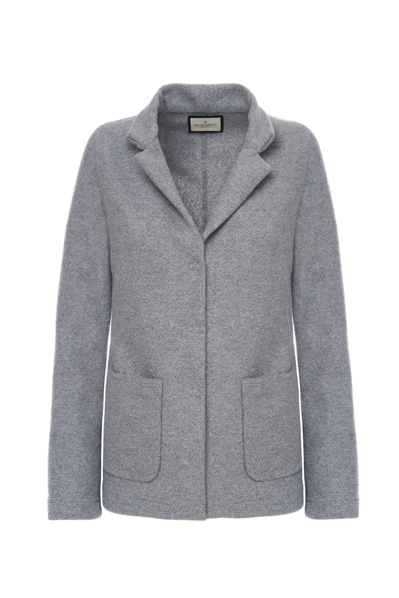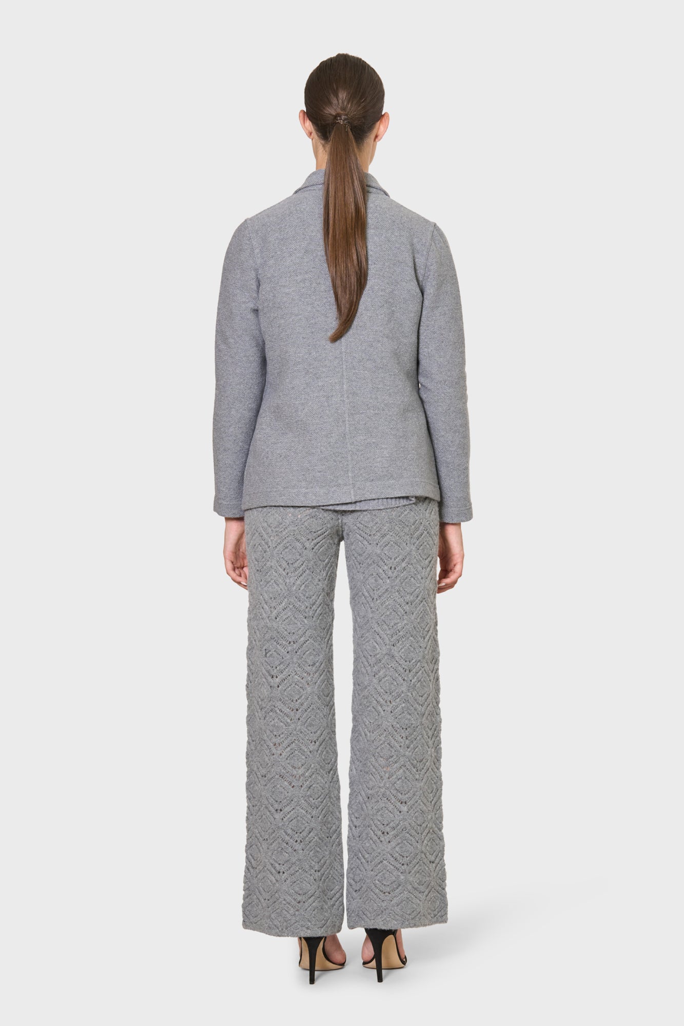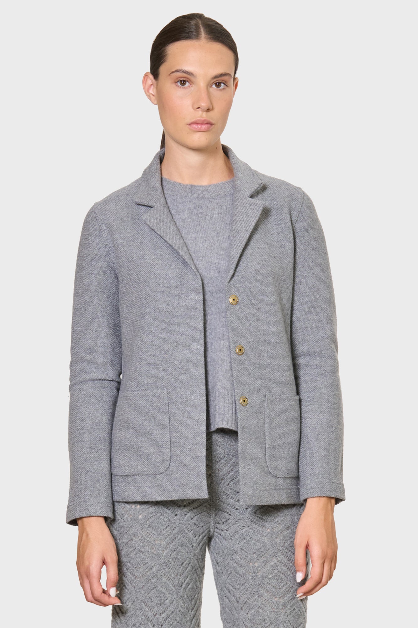 Blazer di tessuto a maglia piquè di 100% lana, 3 bottoni automatici, collo rever, 2 tasche frontali, vestibilità sportiva.