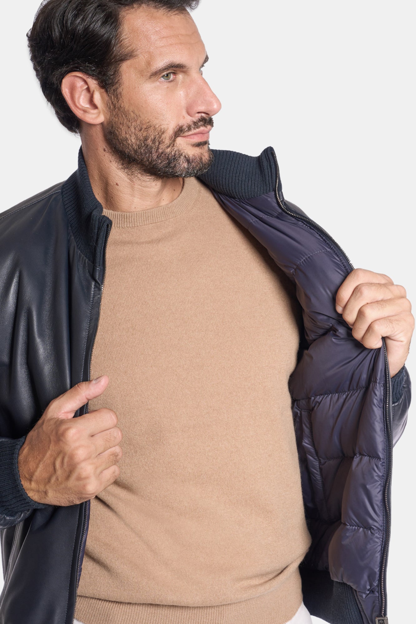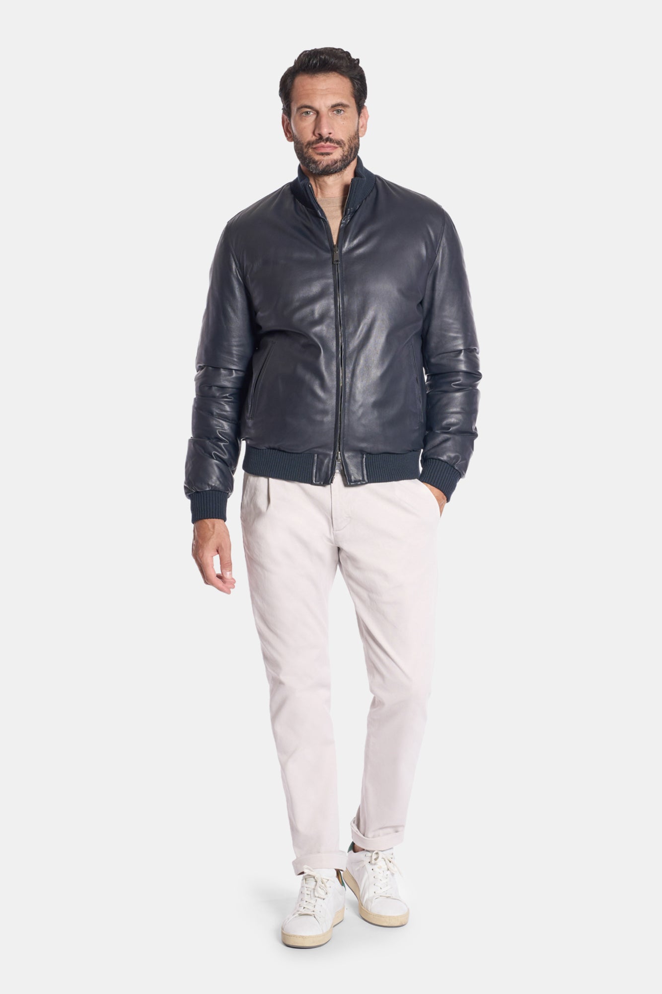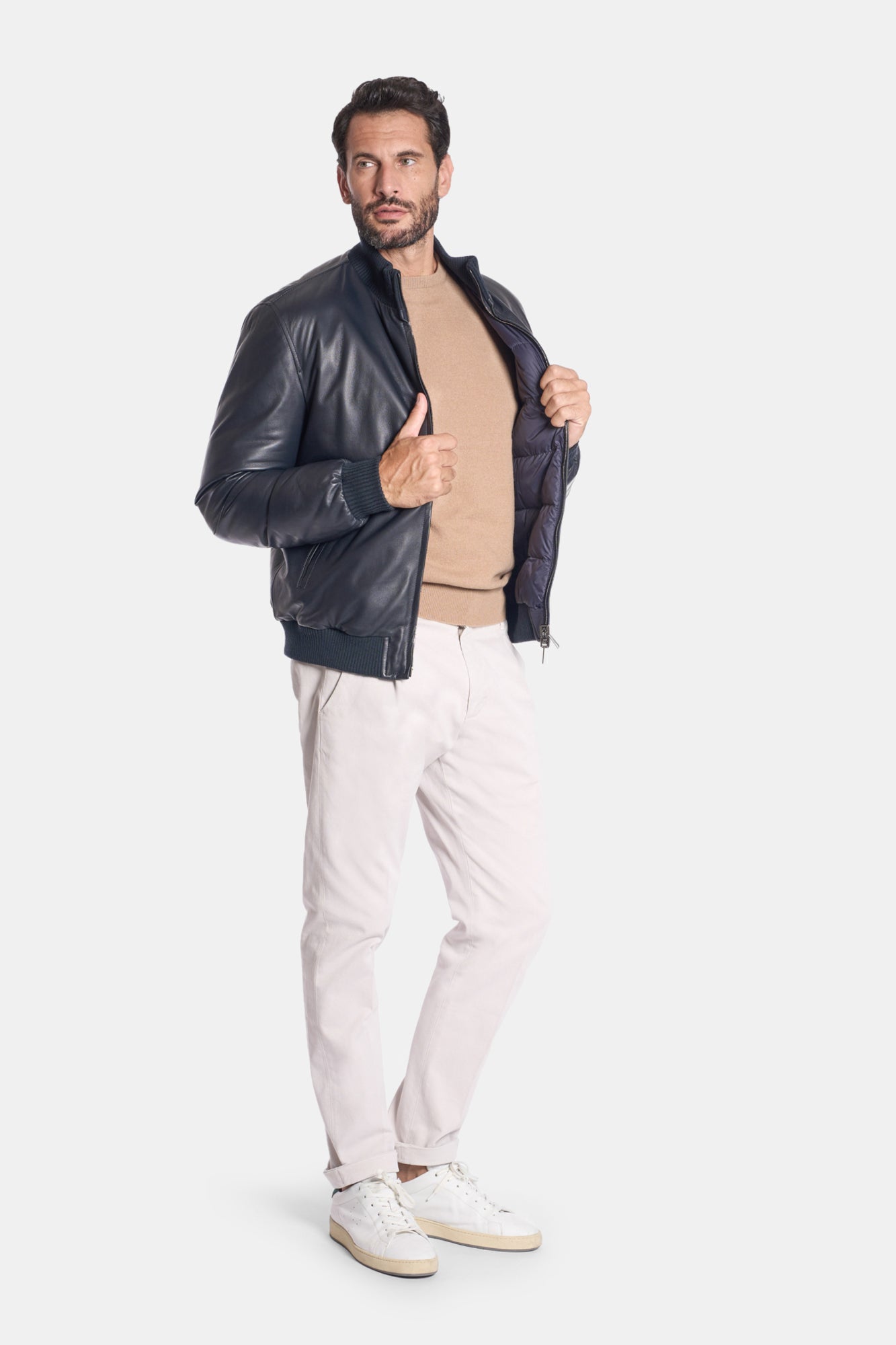 Soft glove leather jacket, reversible with goose down, sporty fit, central zip, two side pockets.