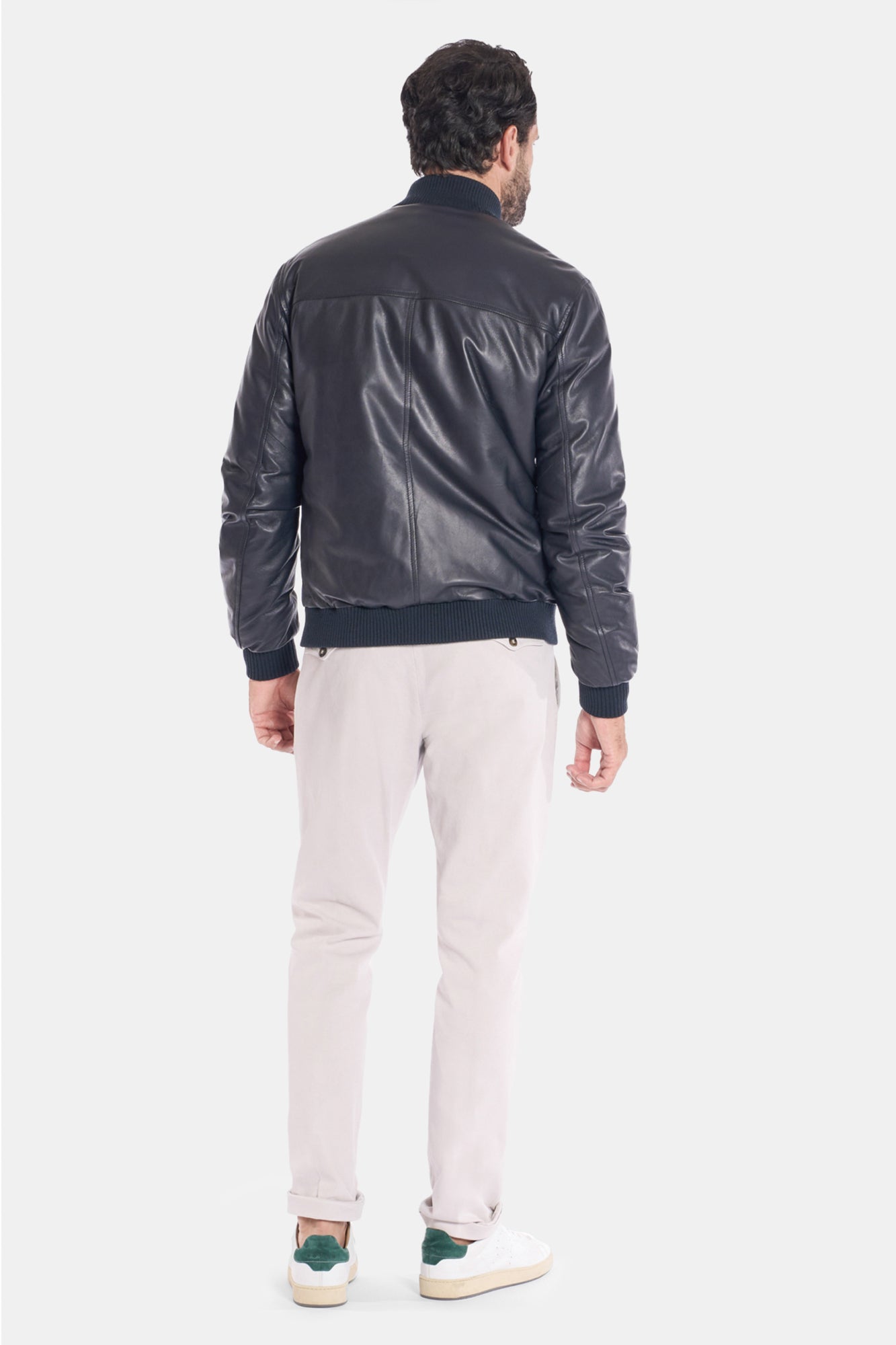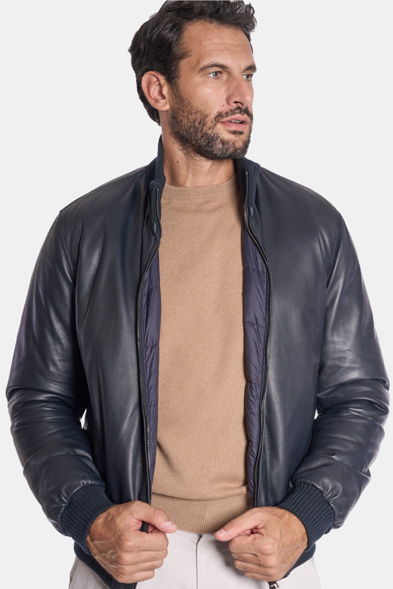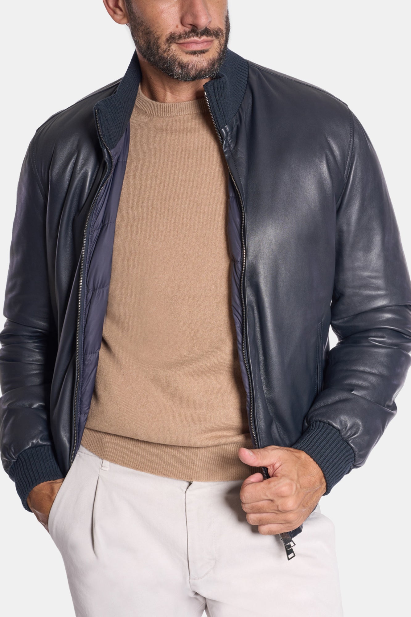 Soft glove leather jacket, reversible with goose down, sporty fit, central zip, two side pockets.