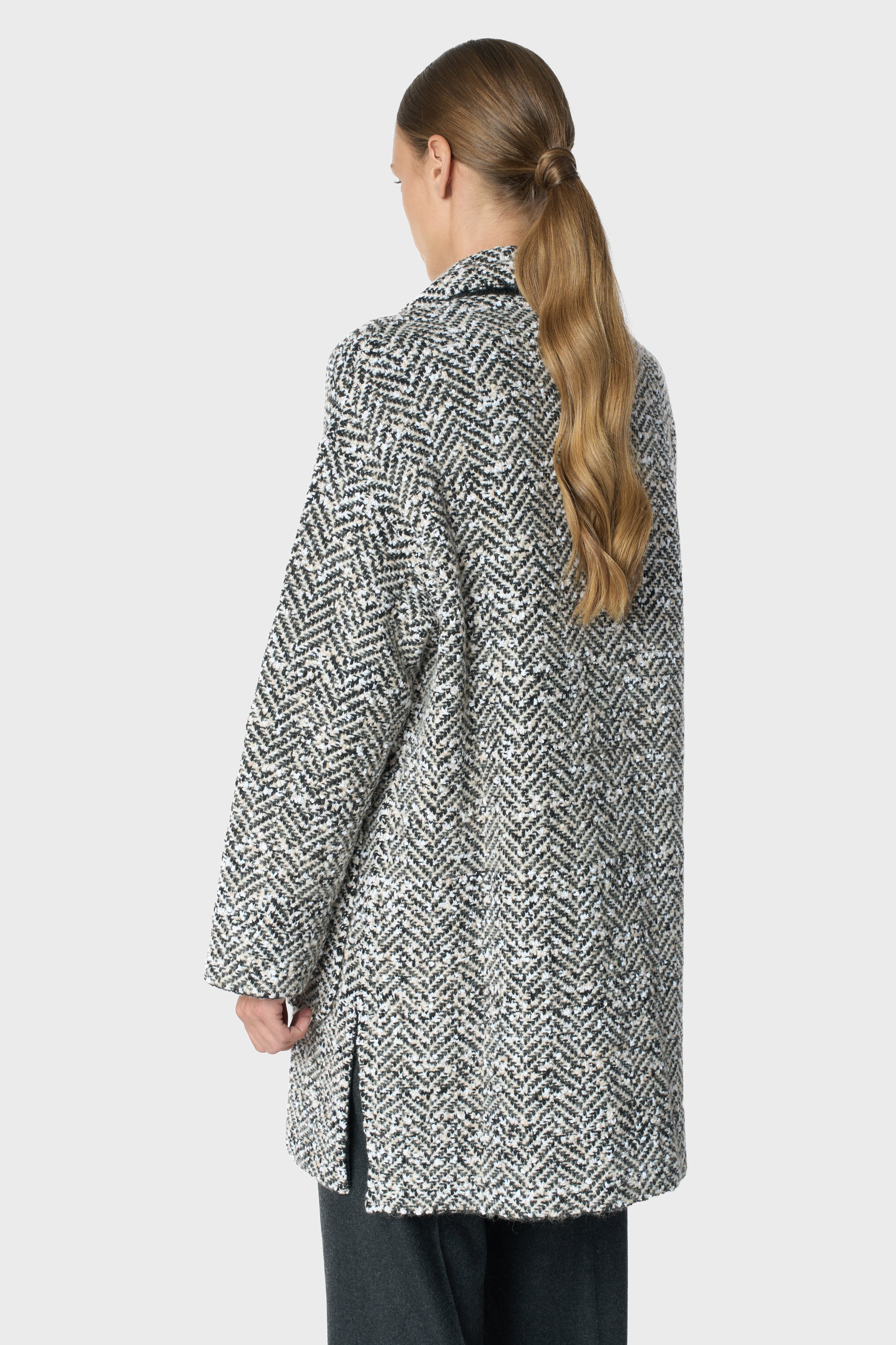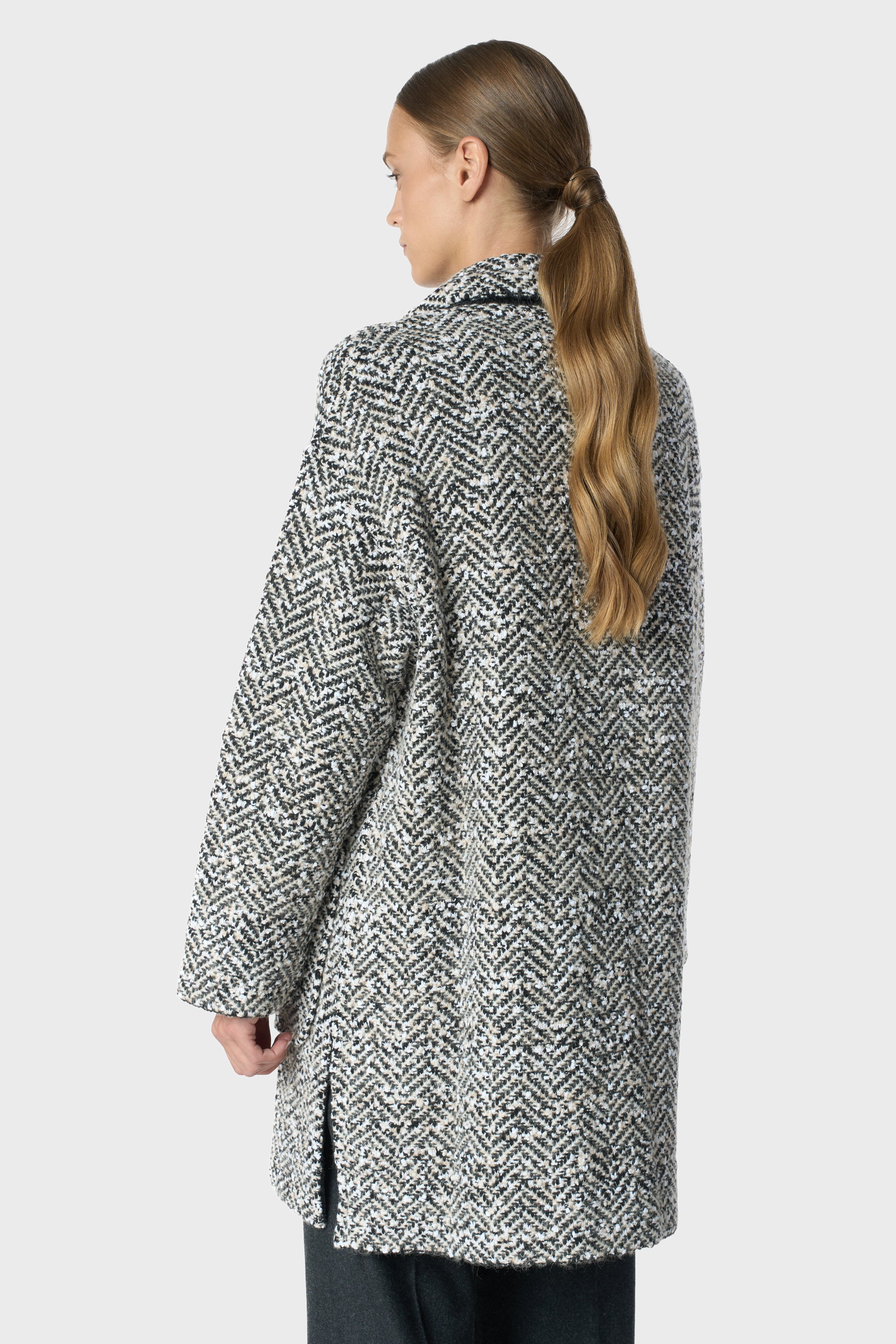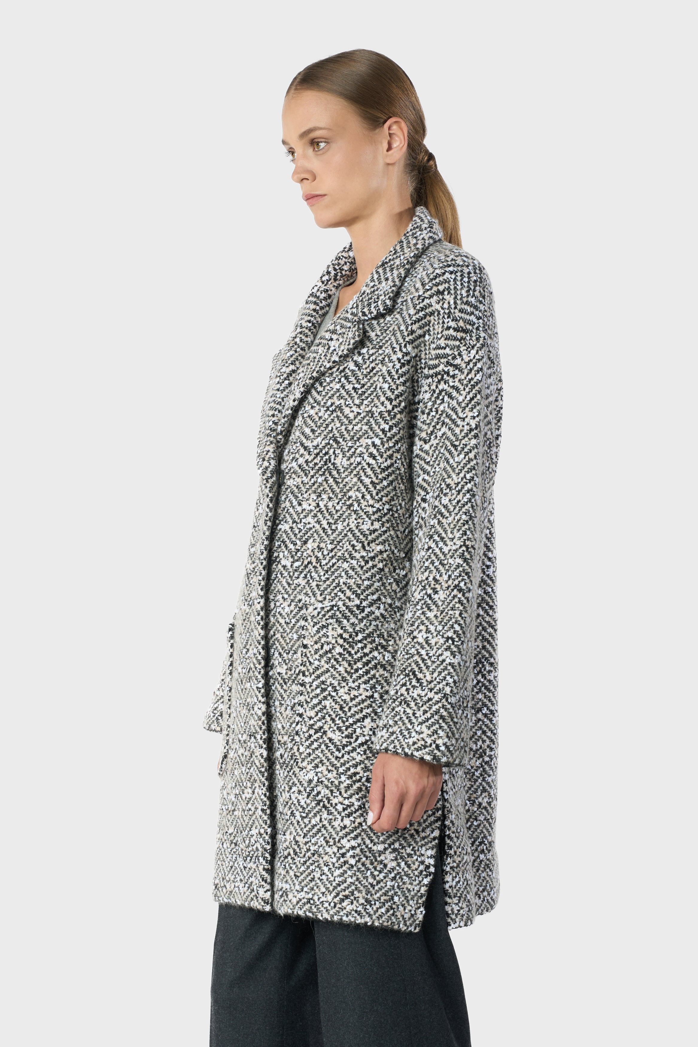 Cashmere, wool and alpaca blend, knitted coat, herringbone knitting, 2 front pockets, rever collar, 5 press buttons, sporty fit