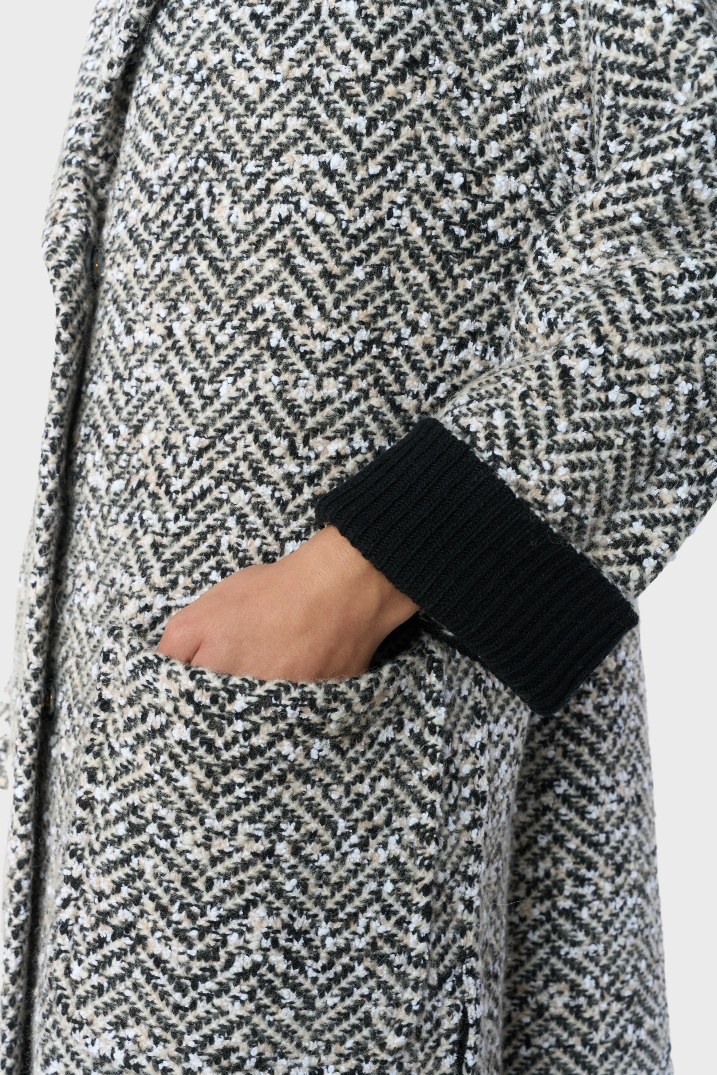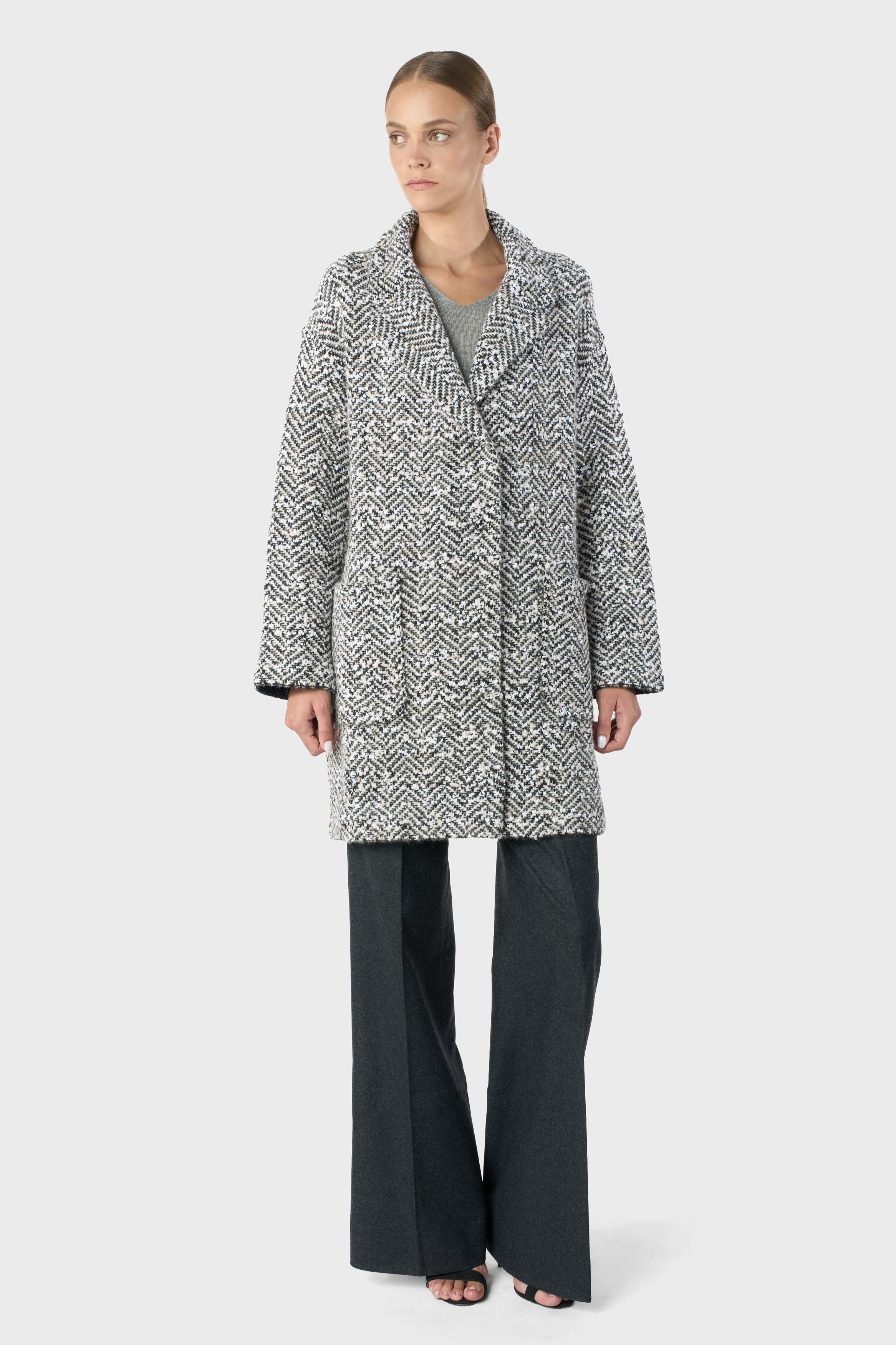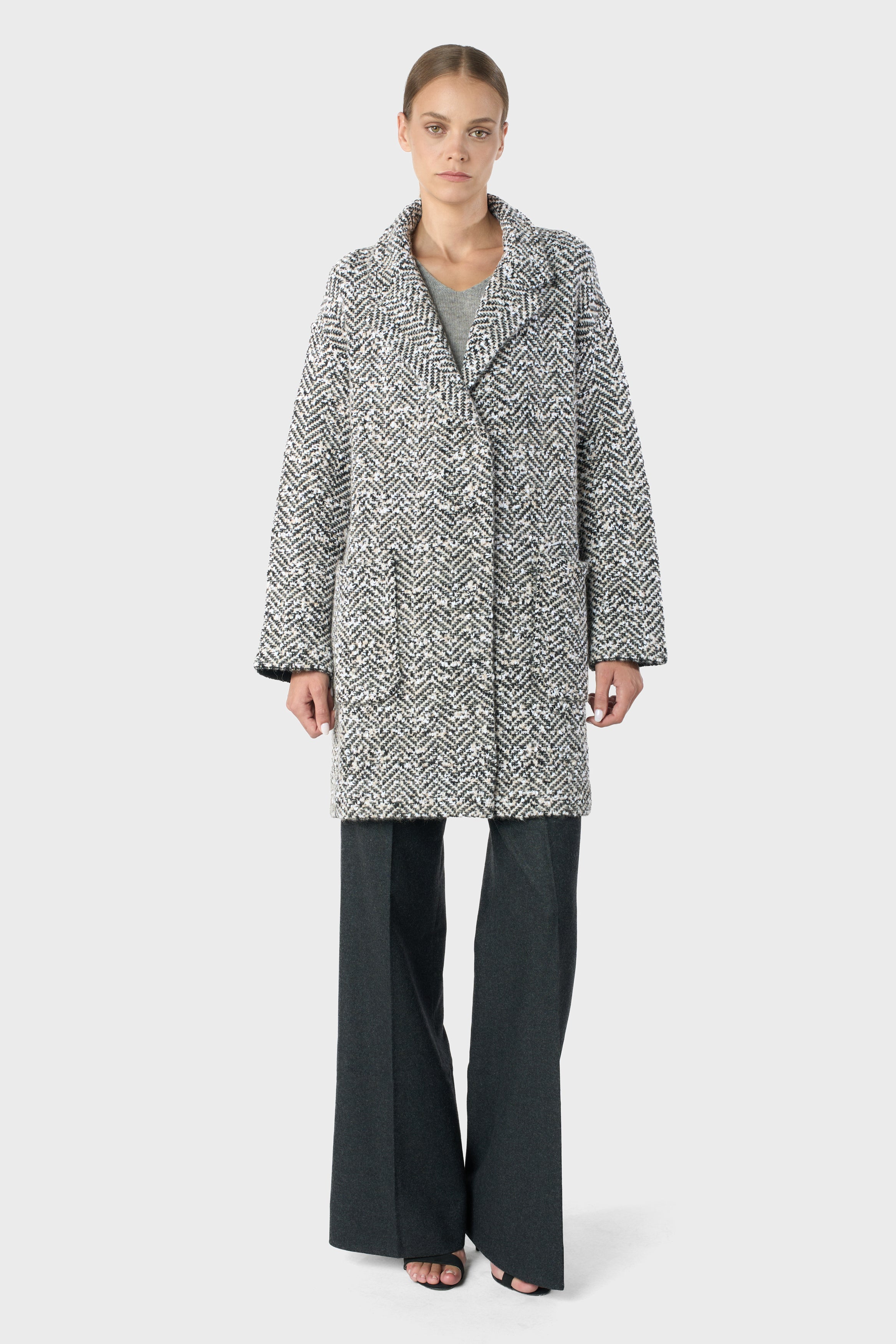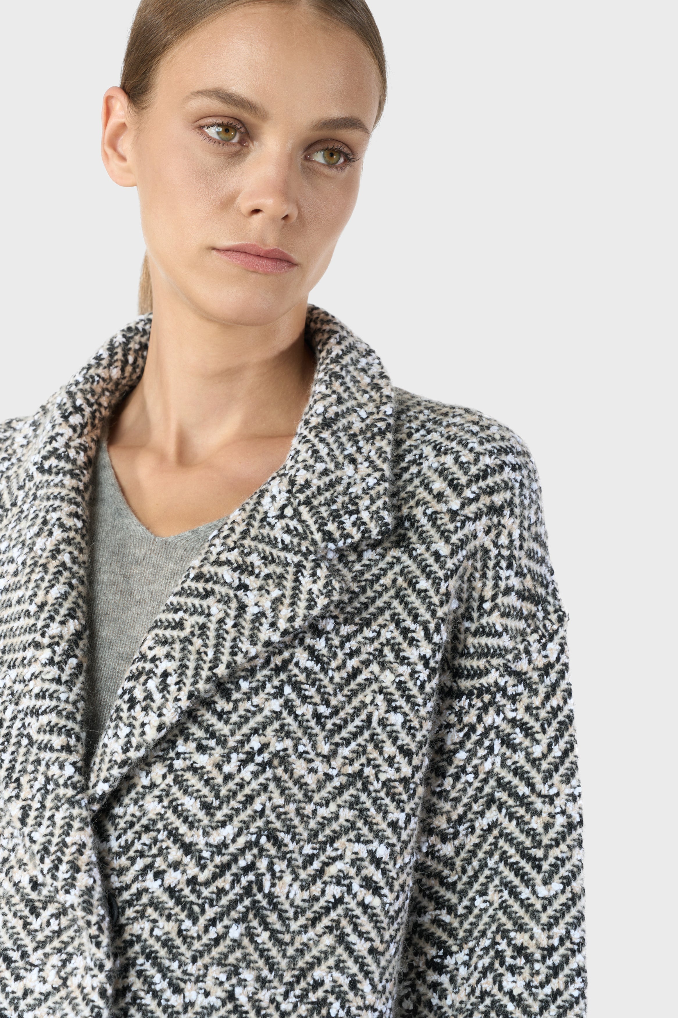 Cashmere, wool and alpaca blend, knitted coat, herringbone knitting, 2 front pockets, rever collar, 5 press buttons, sporty fit