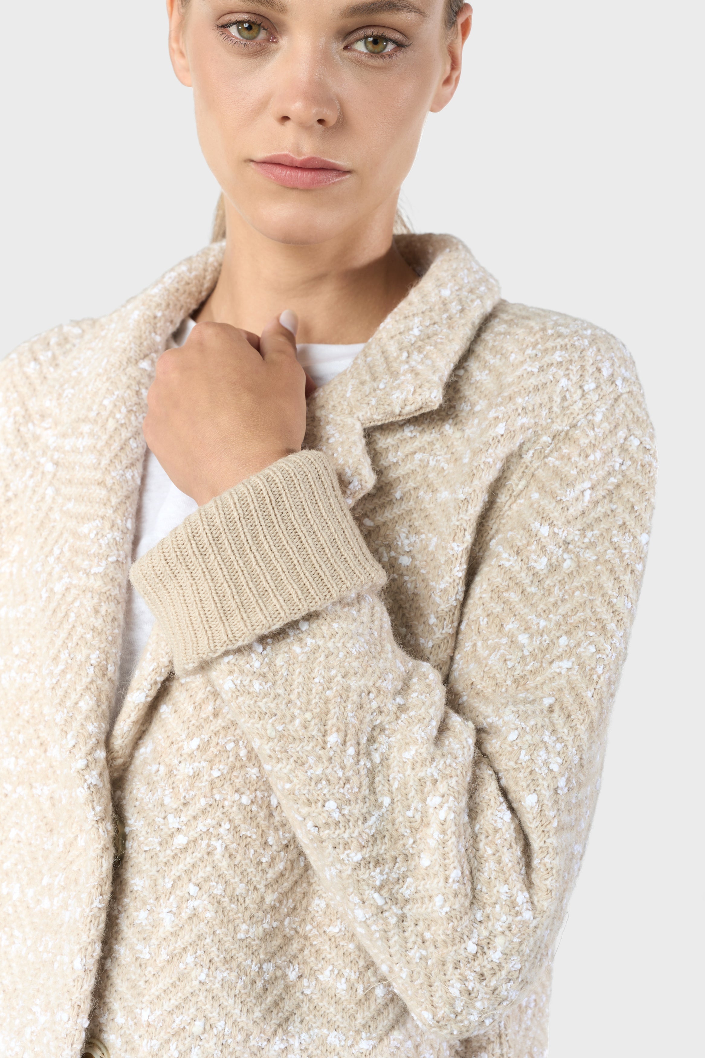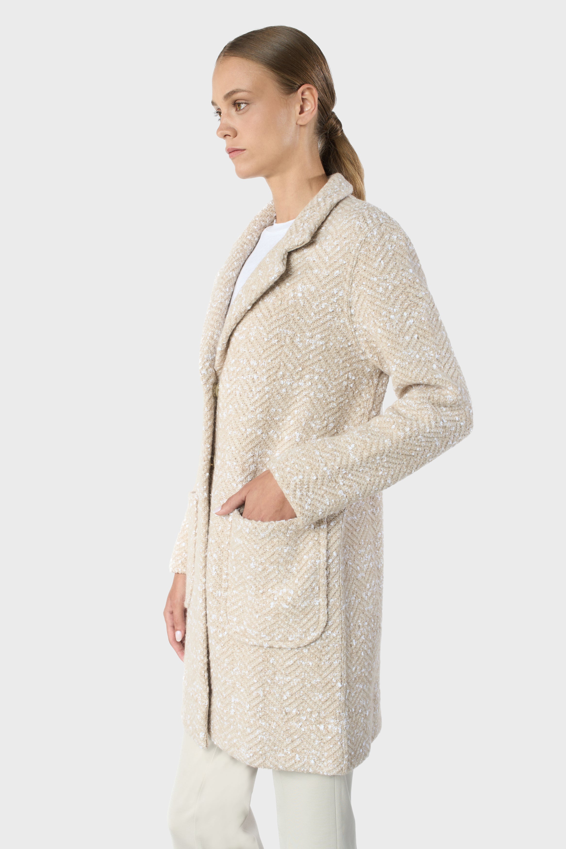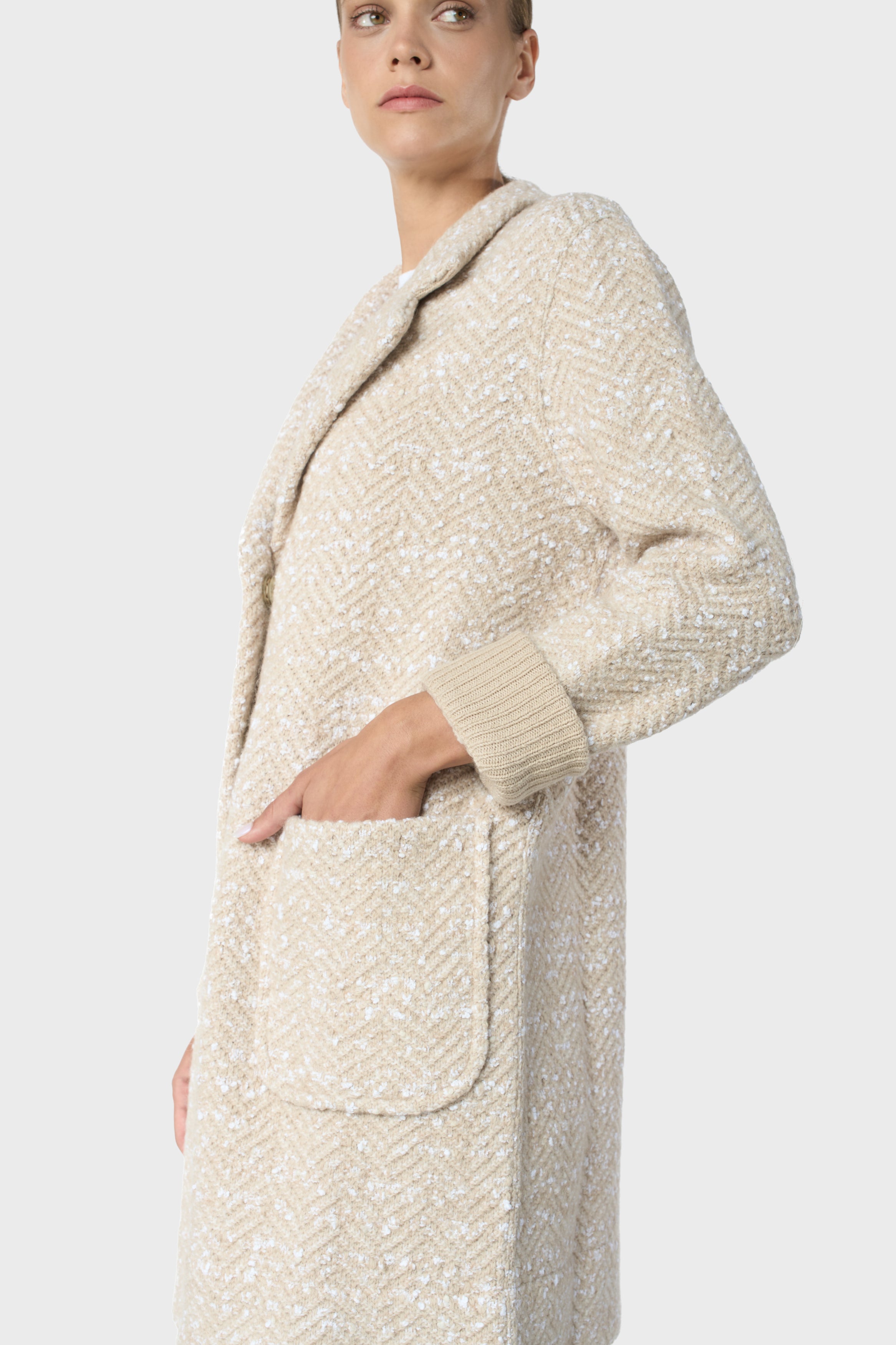 Cashmere, wool and alpaca blend, knitted coat, herringbone knitting, round neck, 2 pockets, 5 press buttons, slim fit.