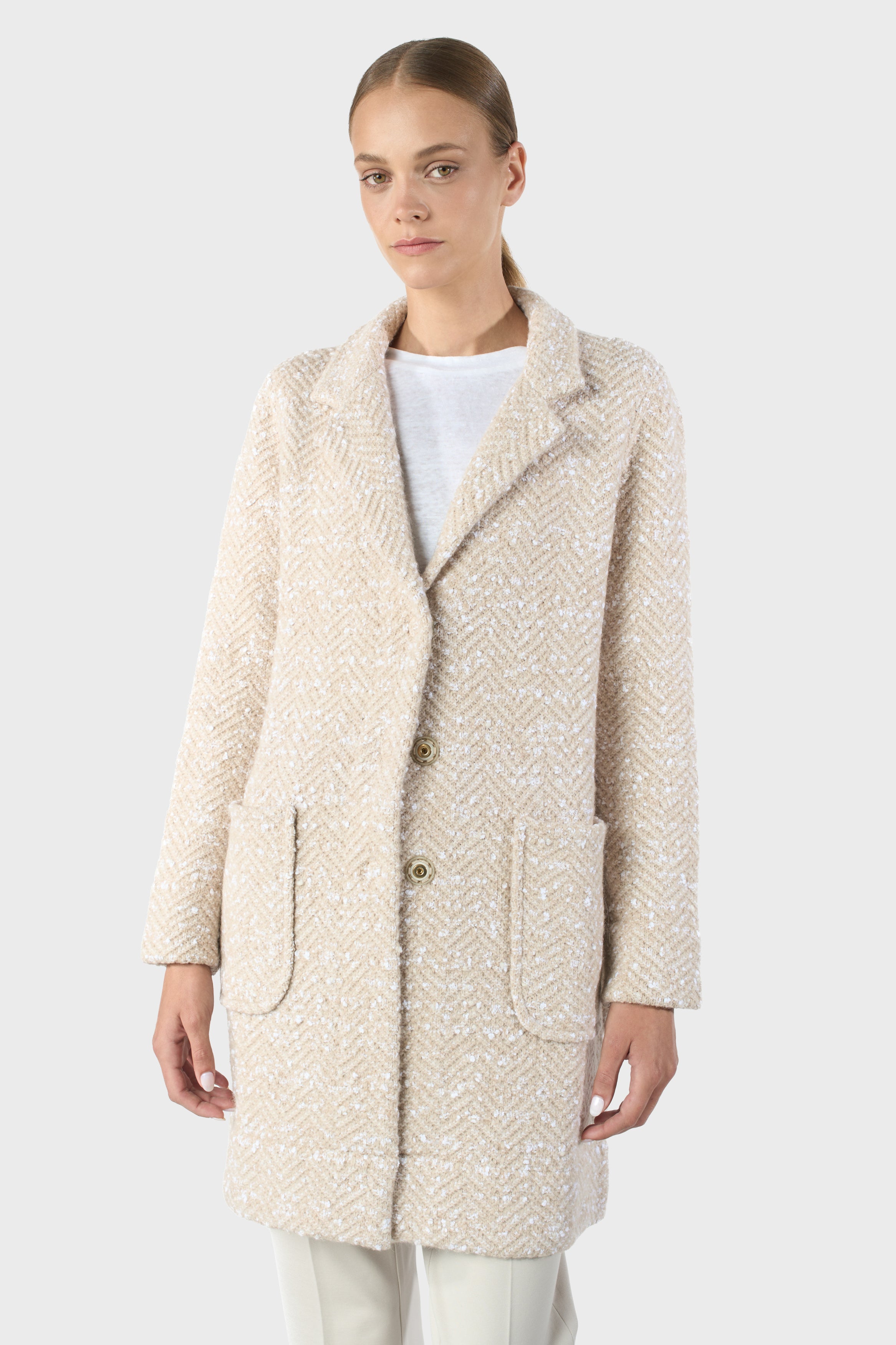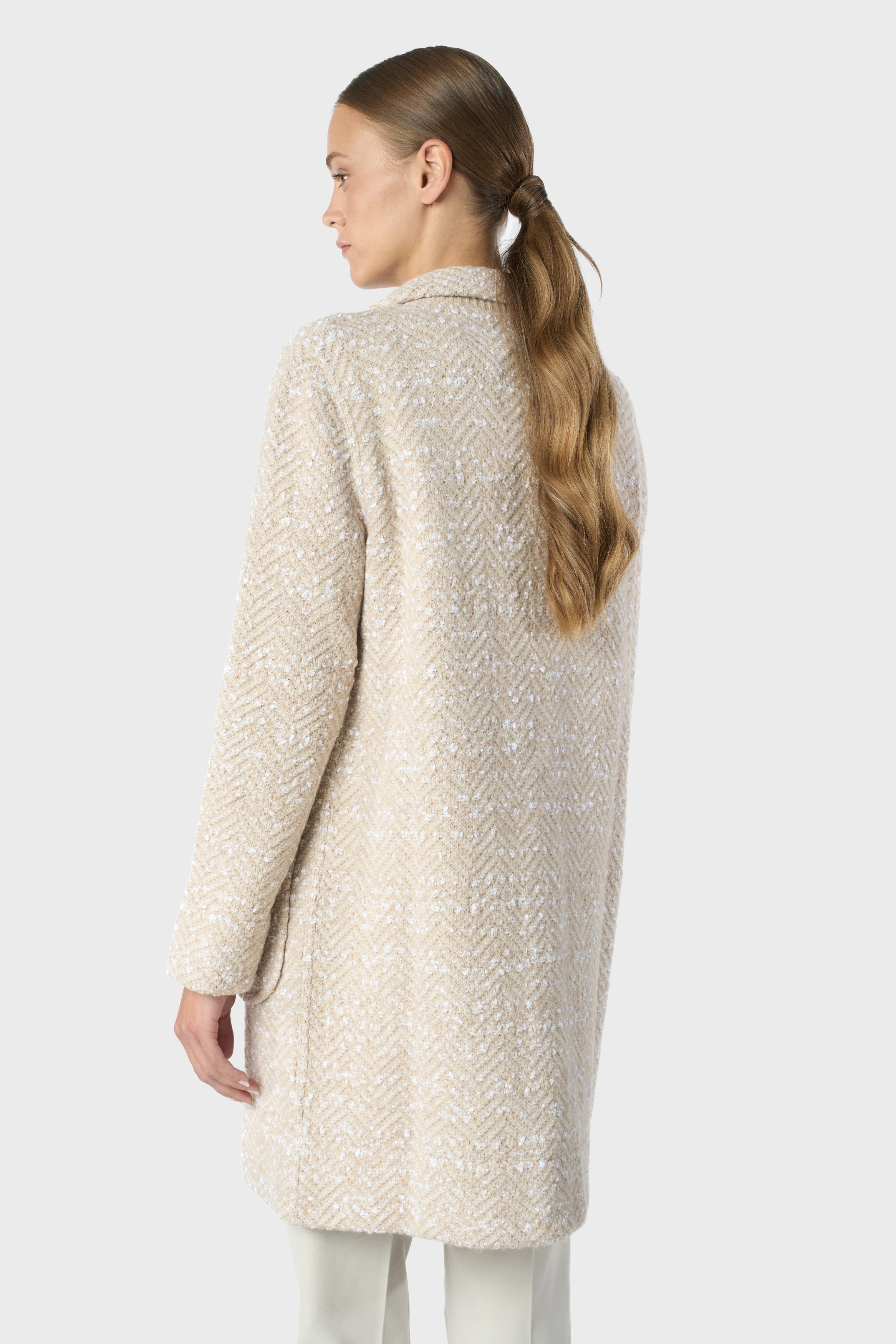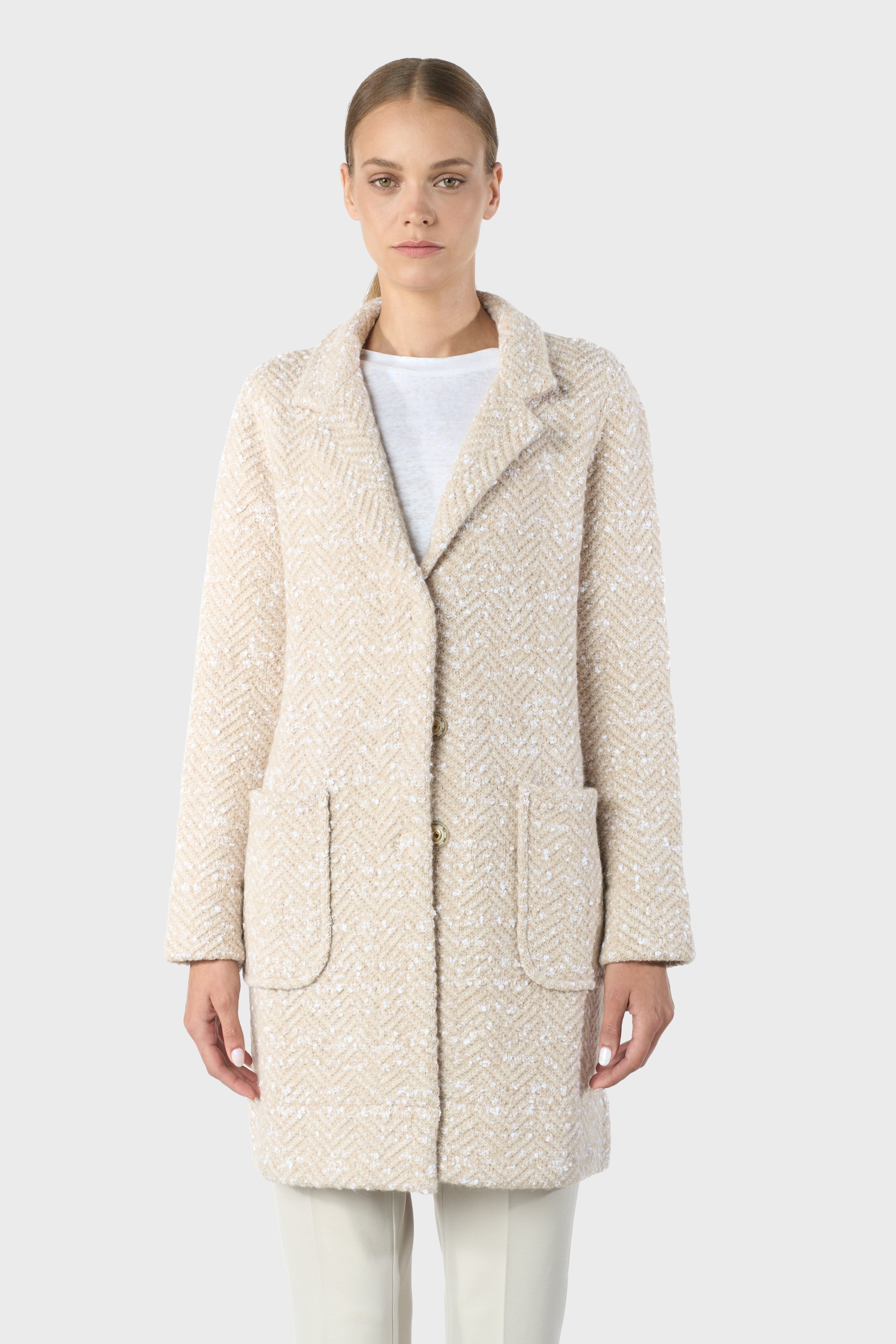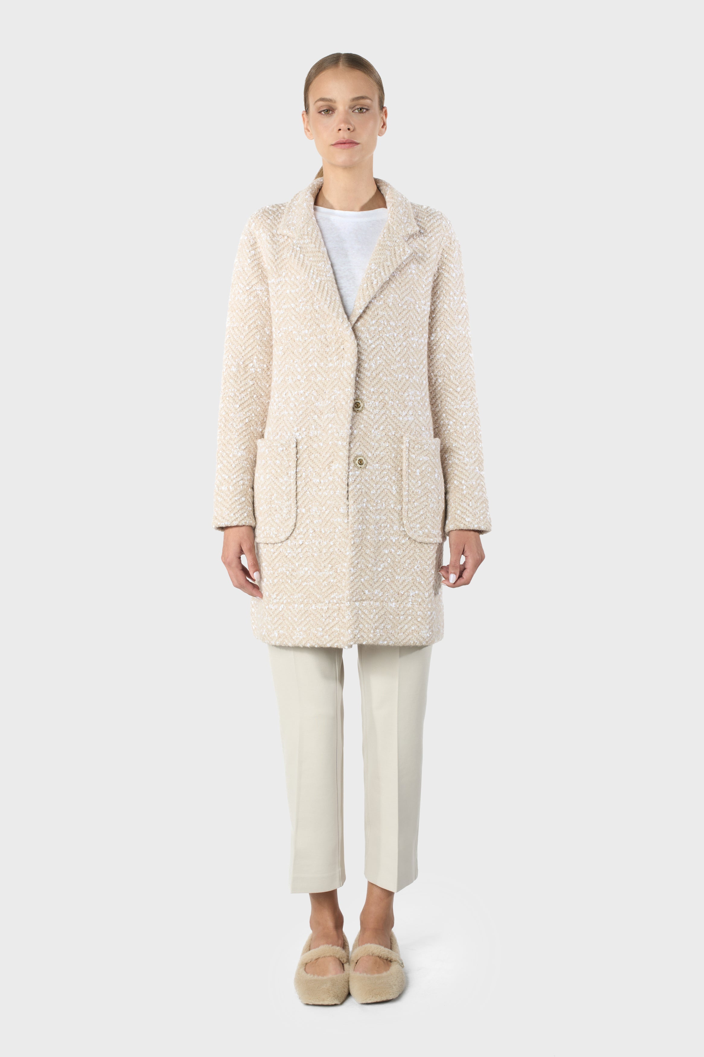 Cashmere, wool and alpaca blend, knitted coat, herringbone knitting, round neck, 2 pockets, 5 press buttons, slim fit.