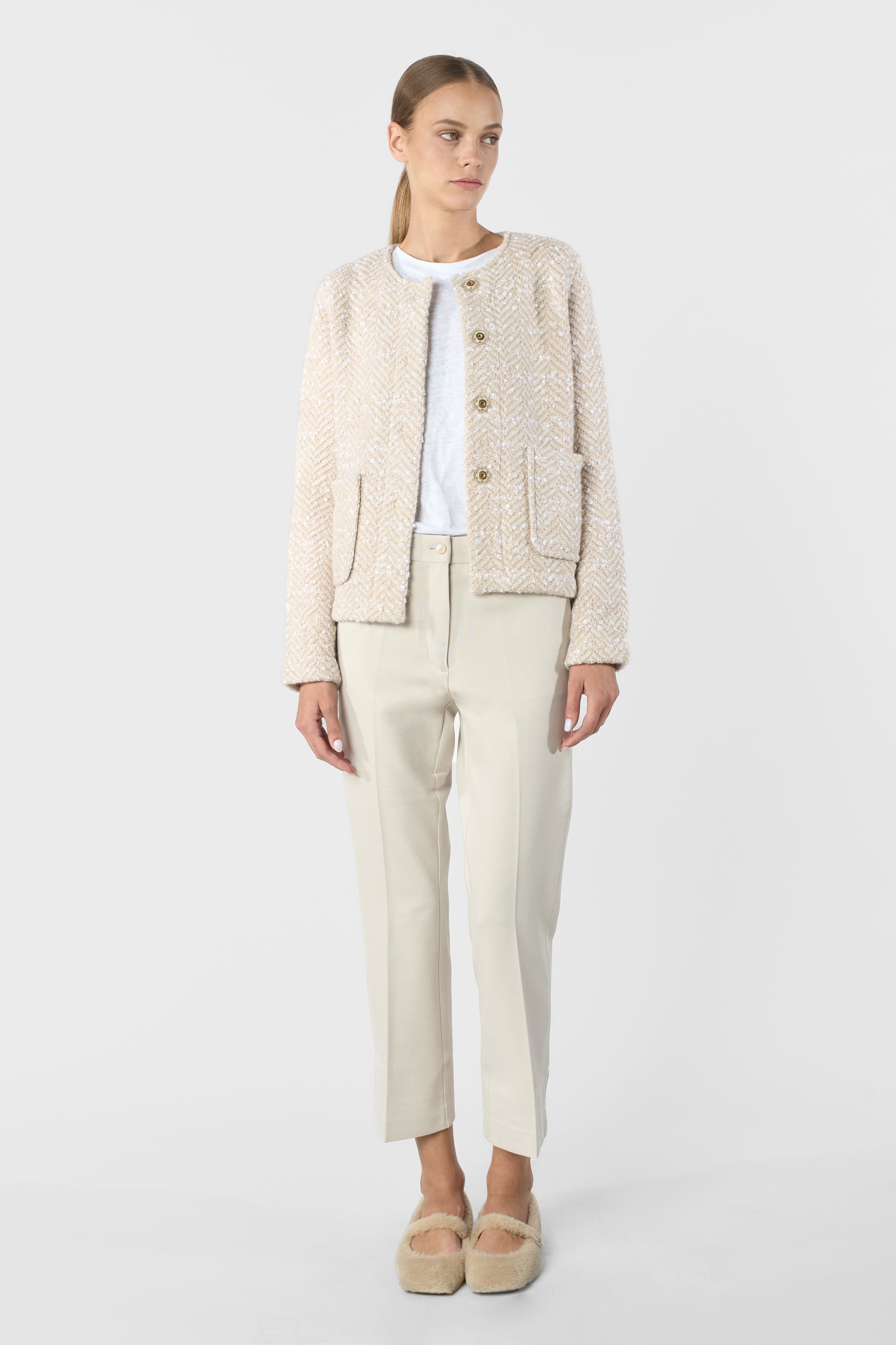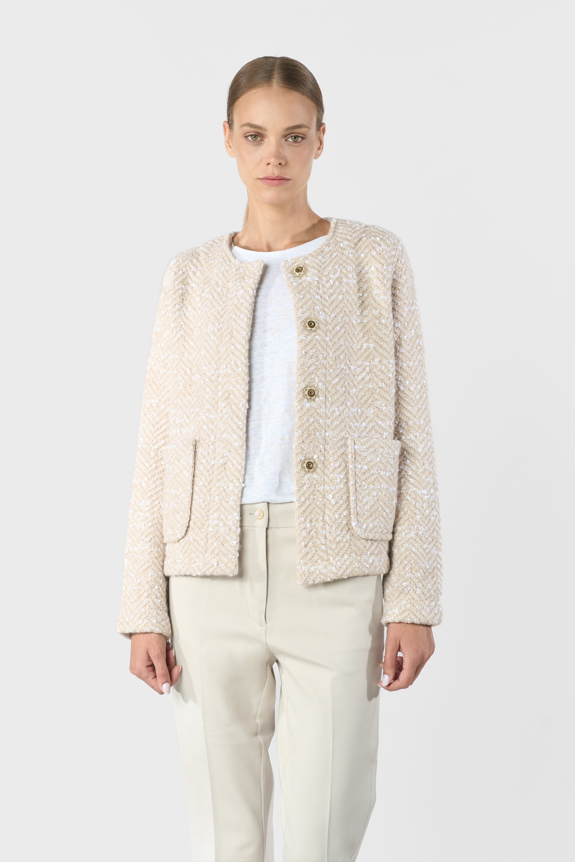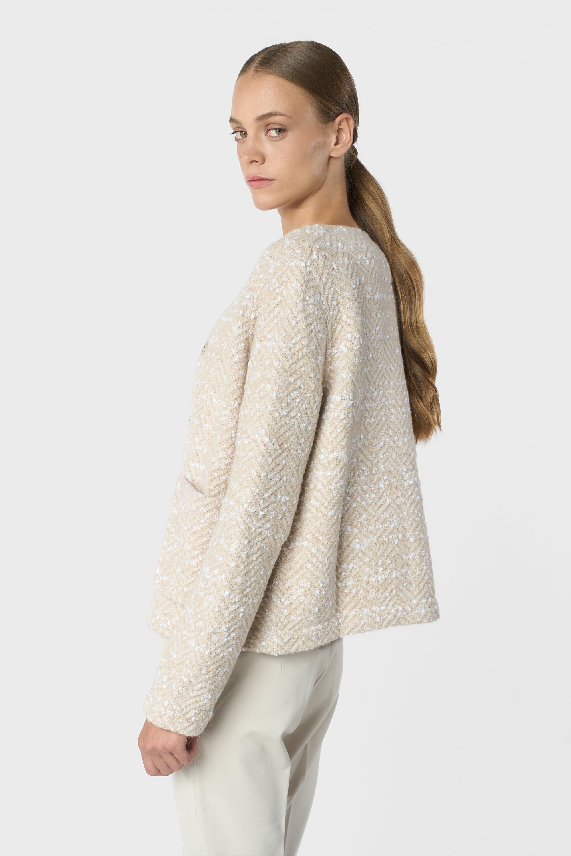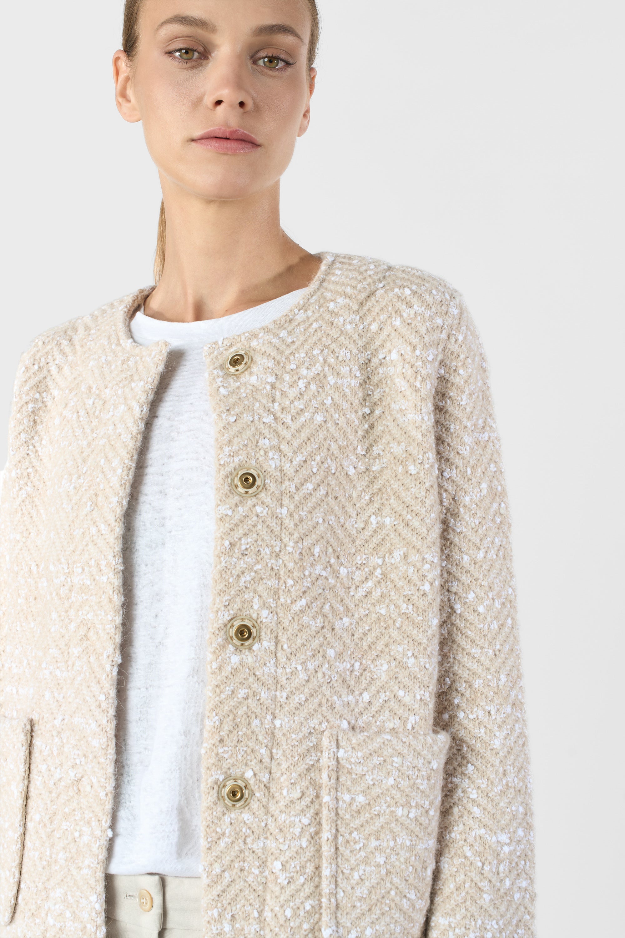 Cashmere, wool and alpaca blend jacket, herringbone knitting, 2 pockets, 5 press buttons, boxy shape