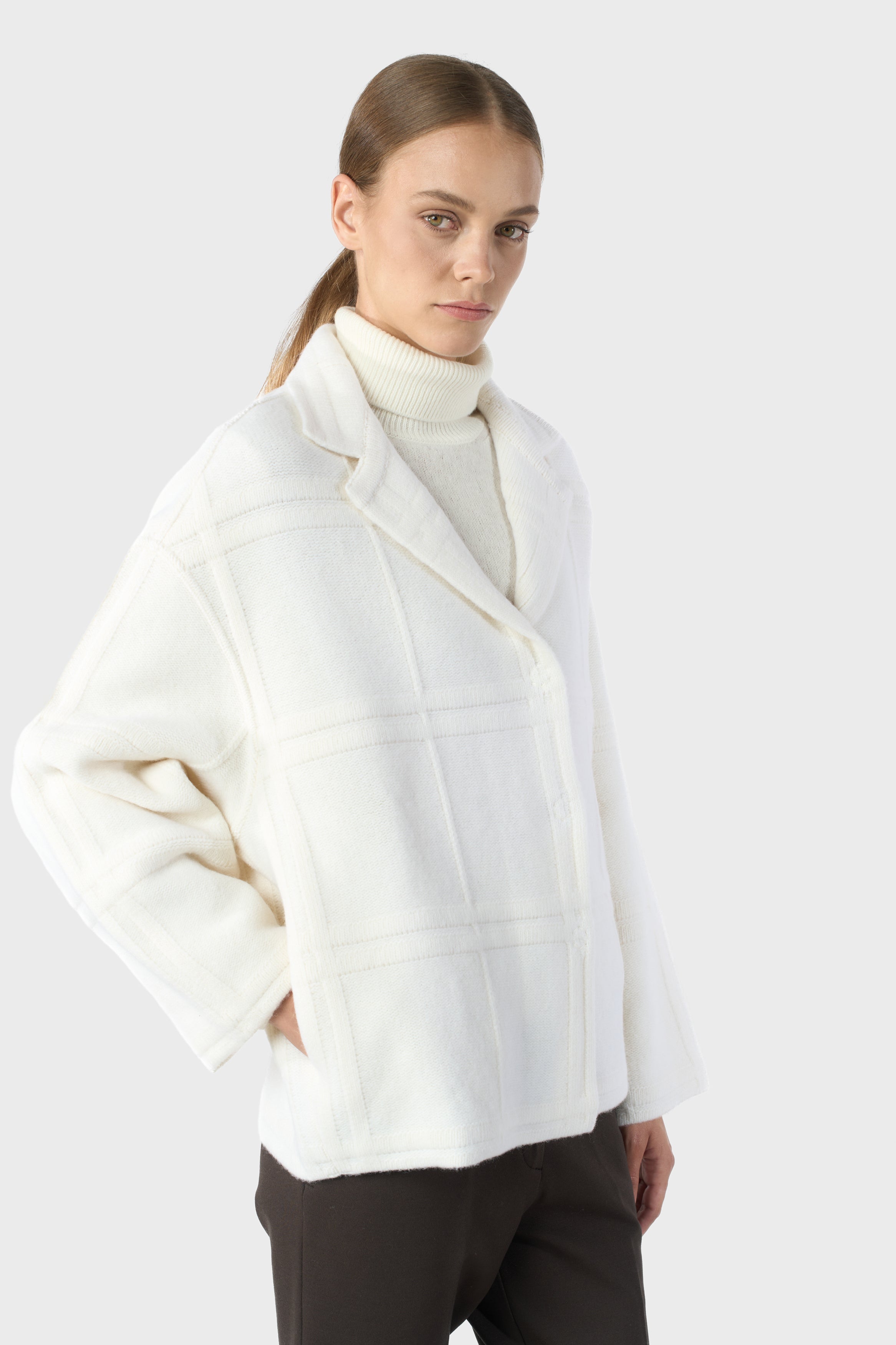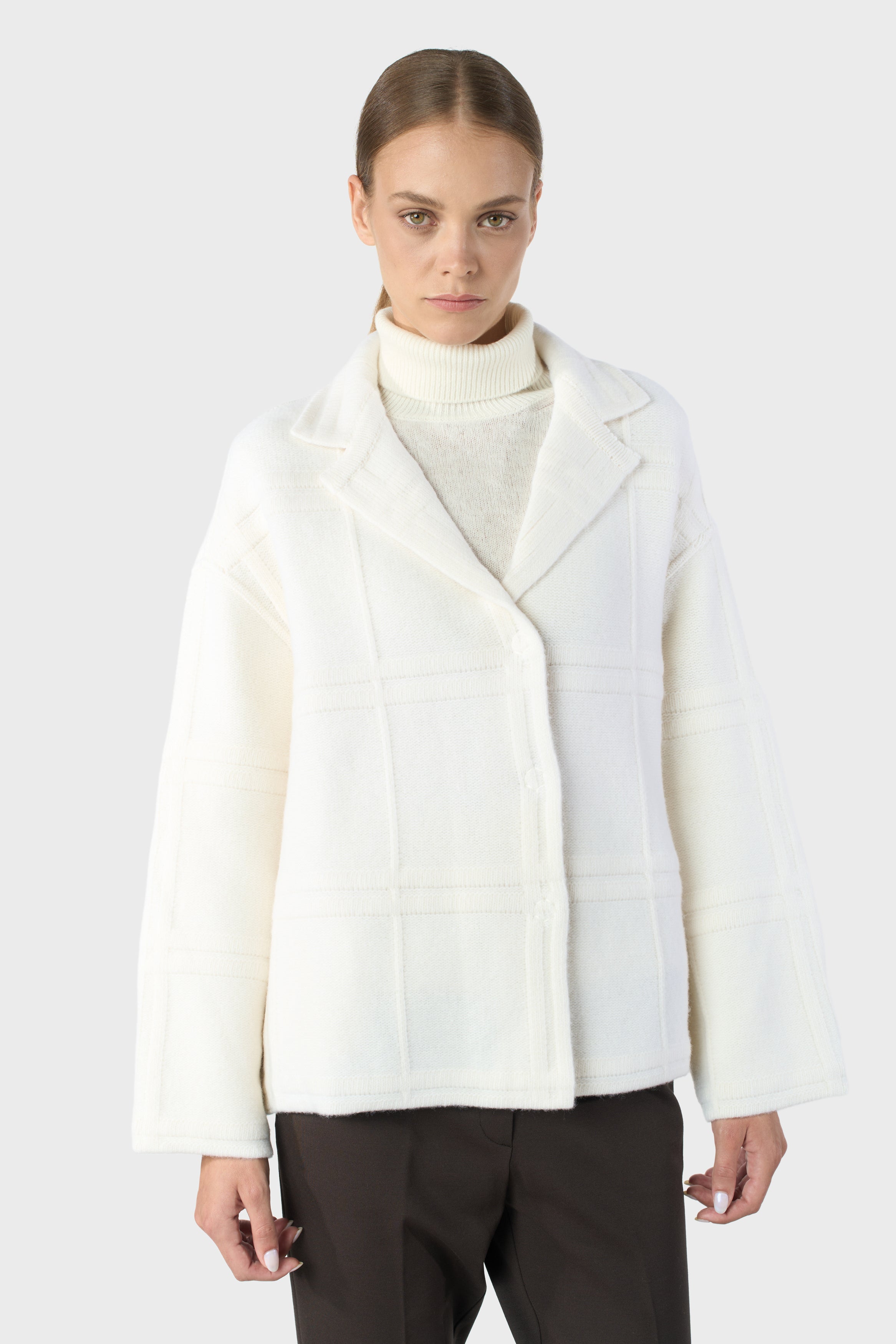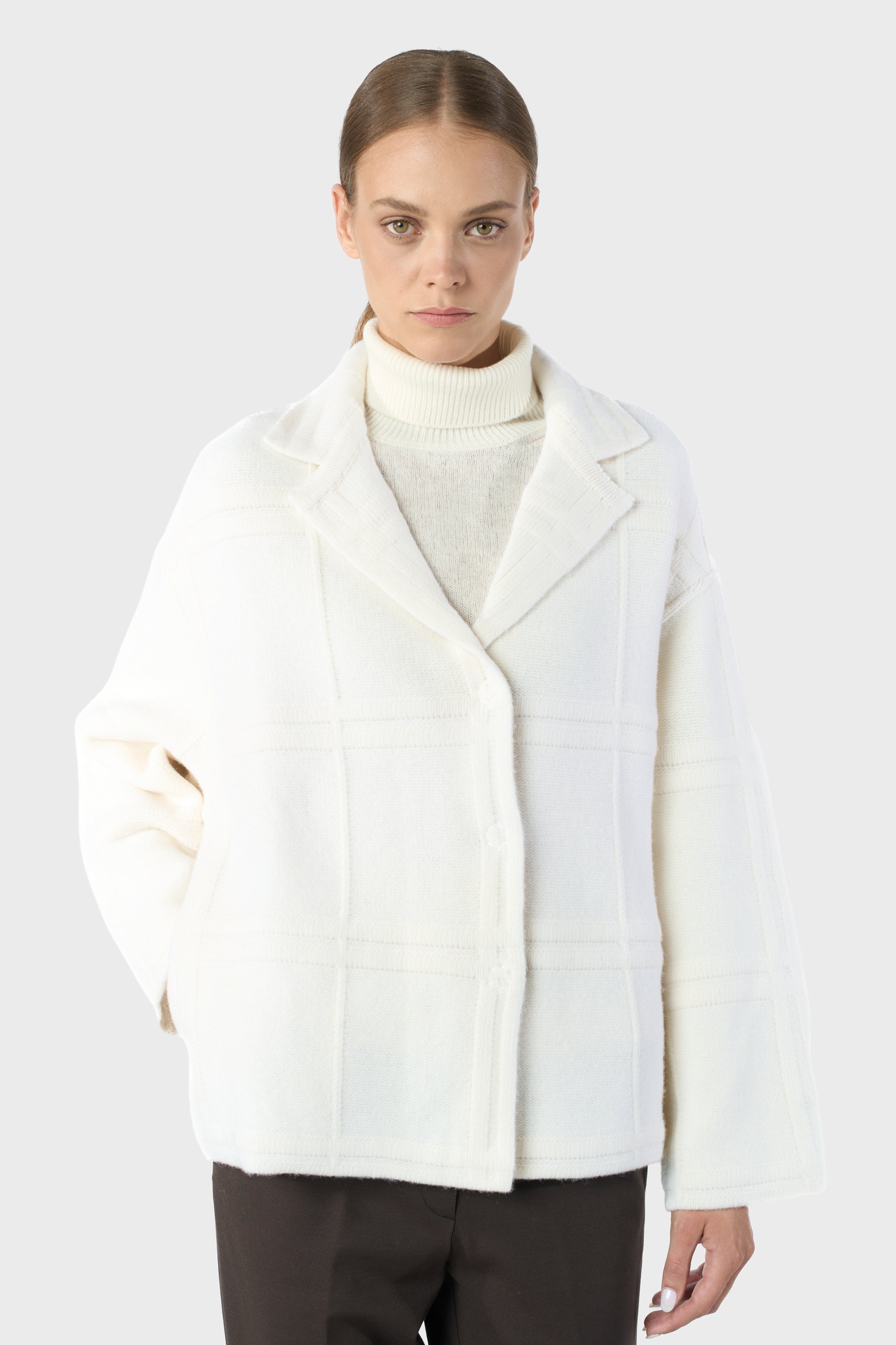 Knitted wool jacket with a check pattern, over shape, 5 press buttons, rever collar, 2 side pockets.