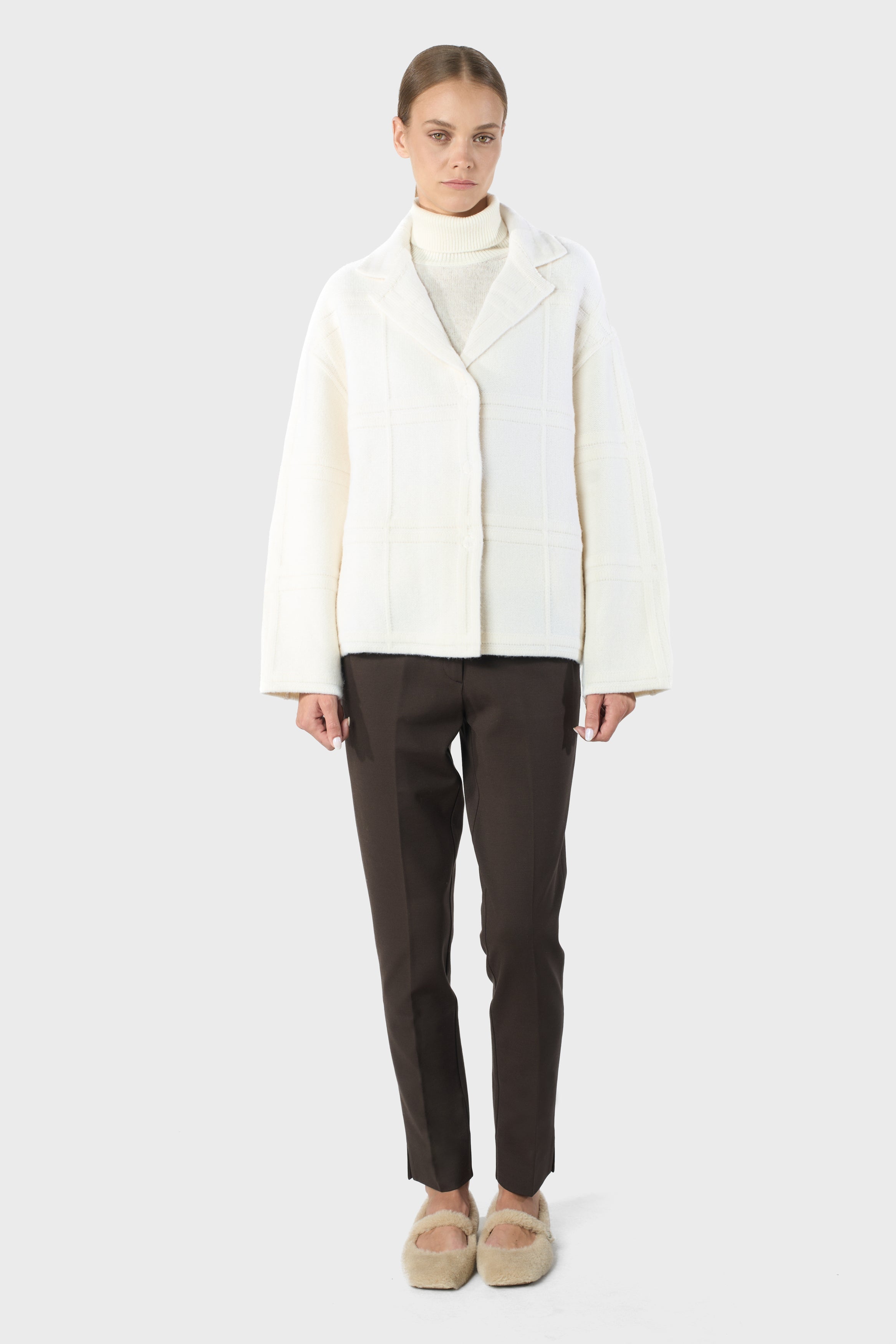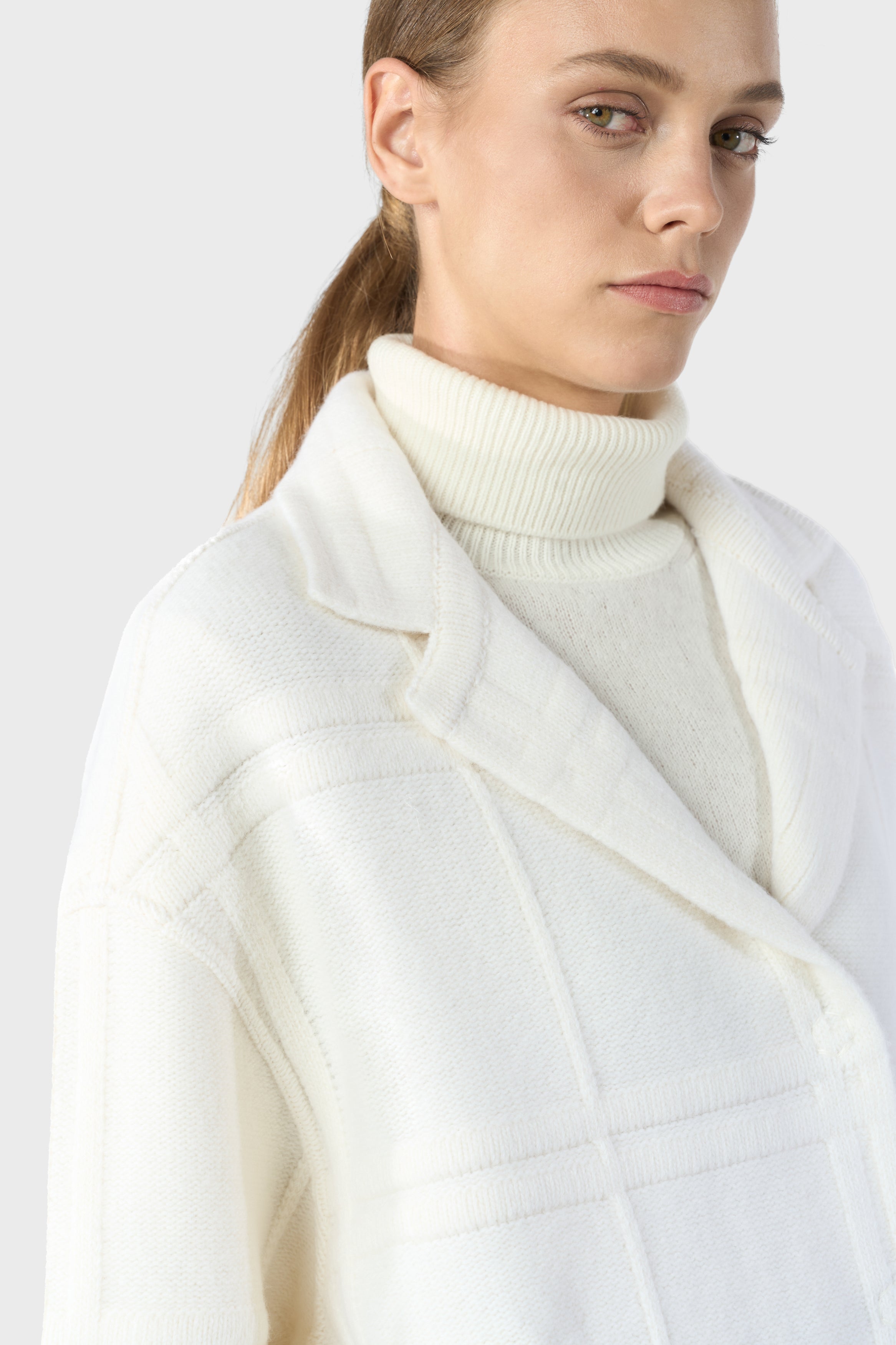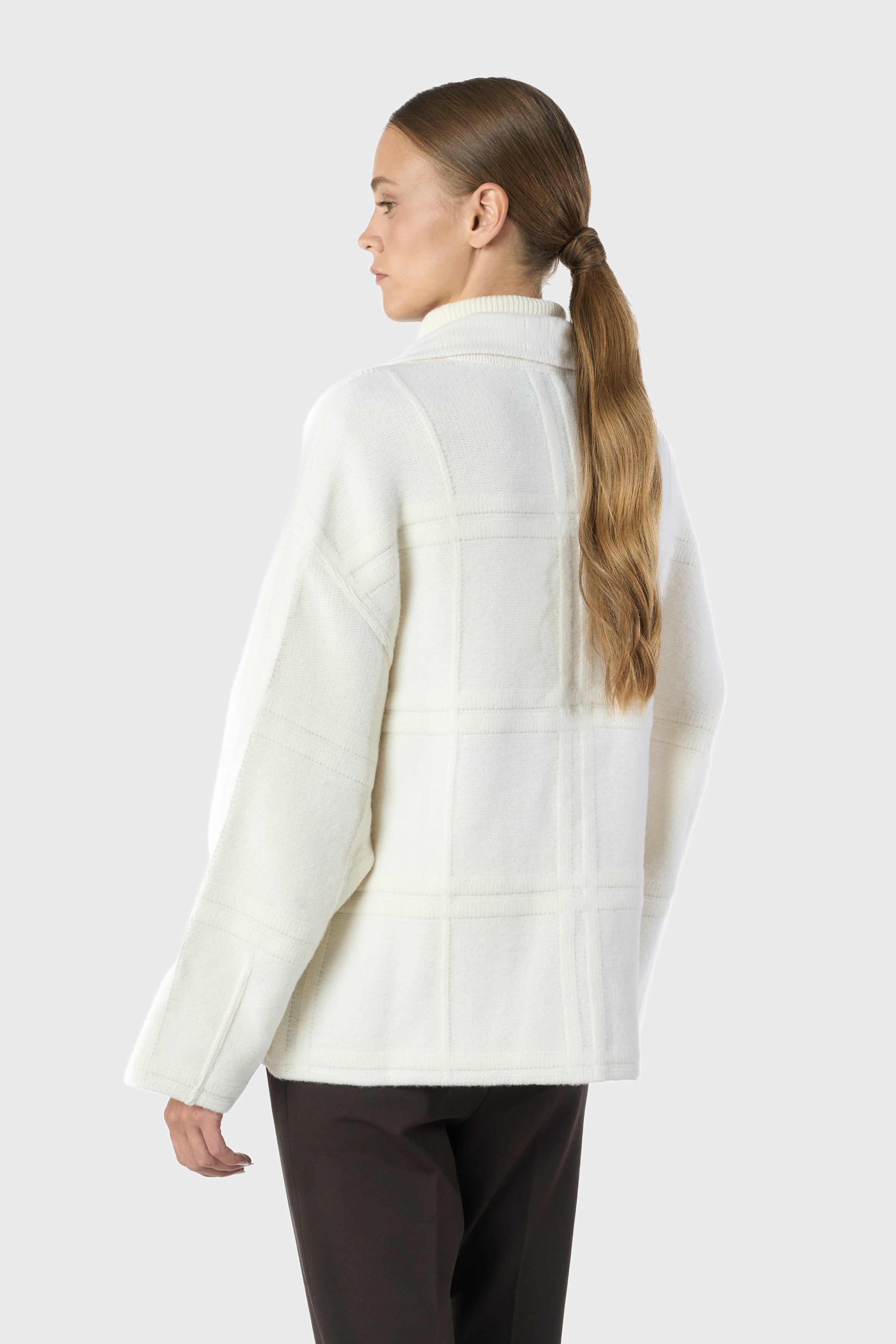 Knitted wool jacket with a check pattern, over shape, 5 press buttons, rever collar, 2 side pockets.