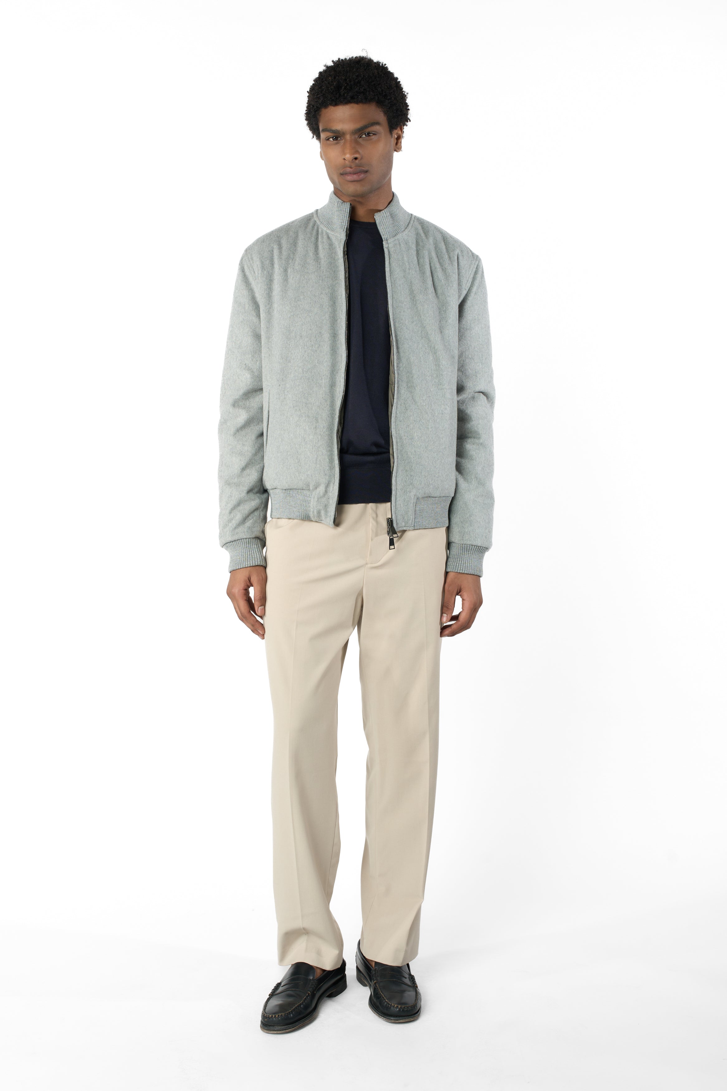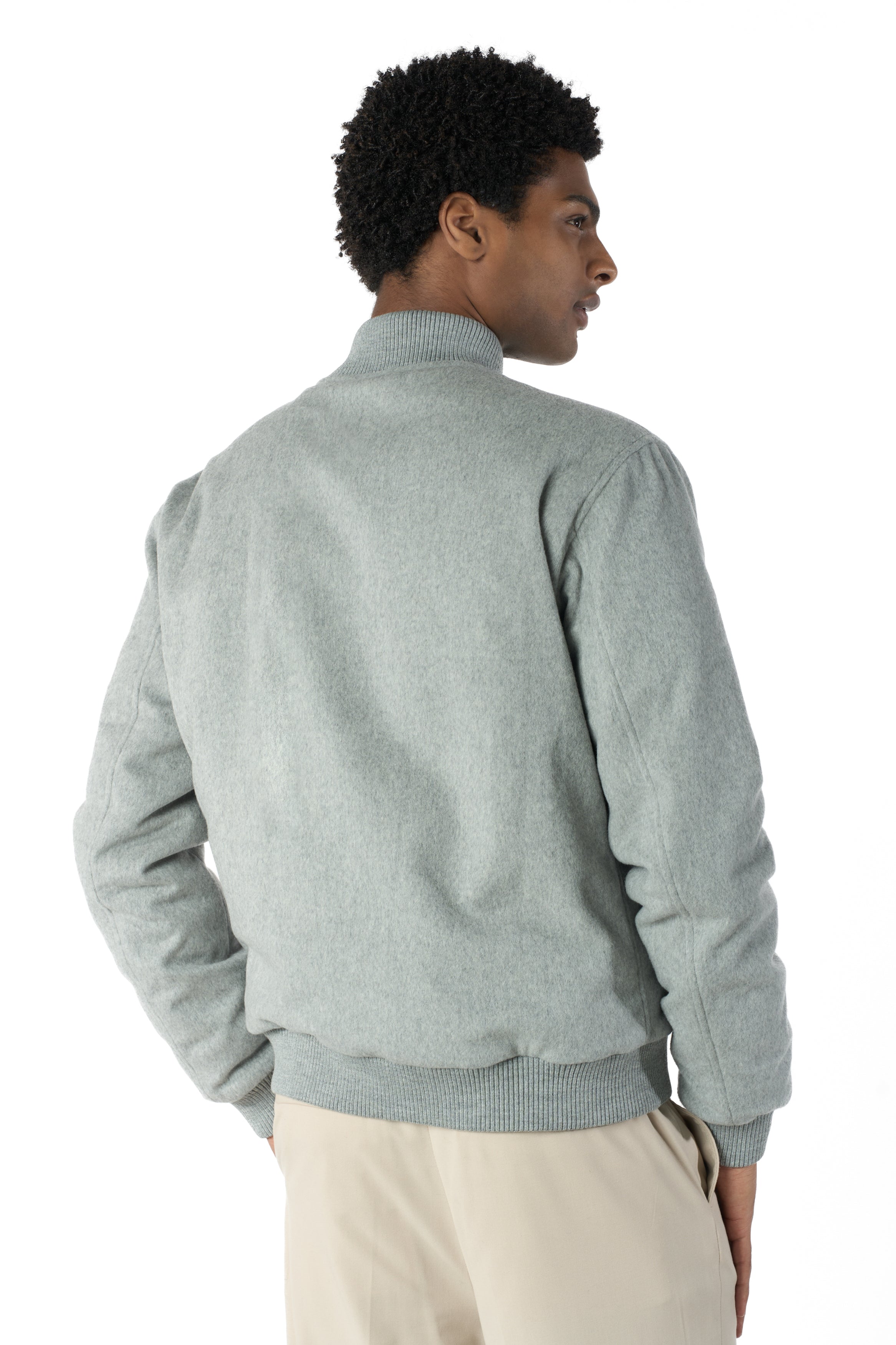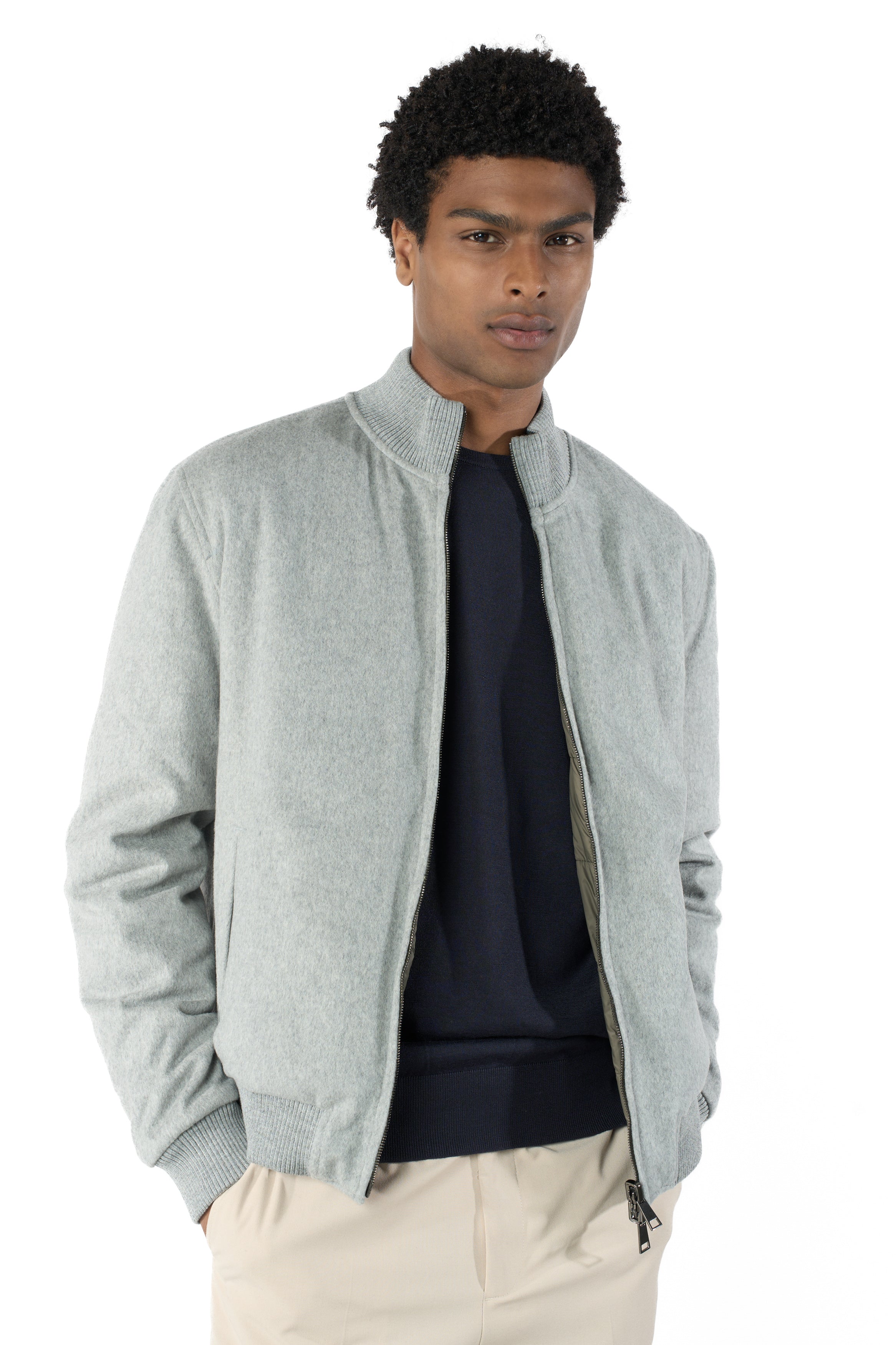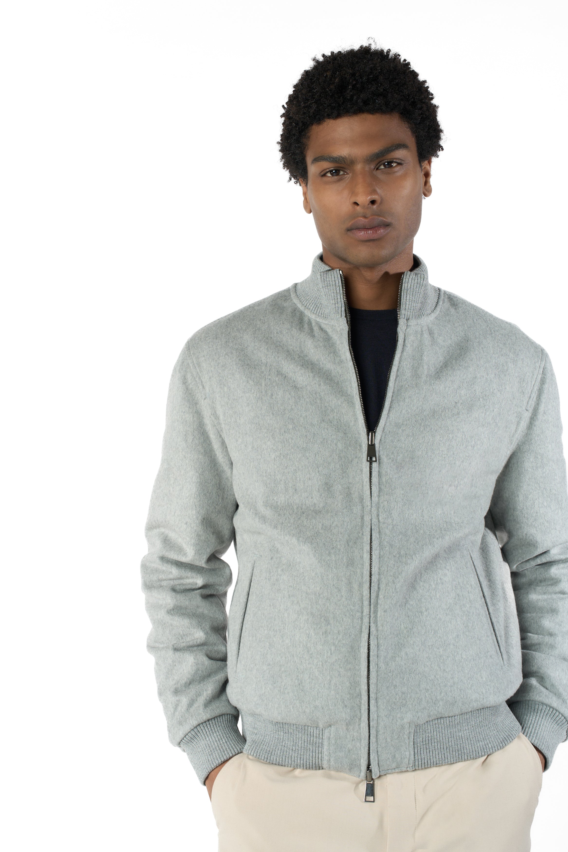 Cashmere-blend bomber jacket, reversible, soft down on the back, central zip, two side pockets.