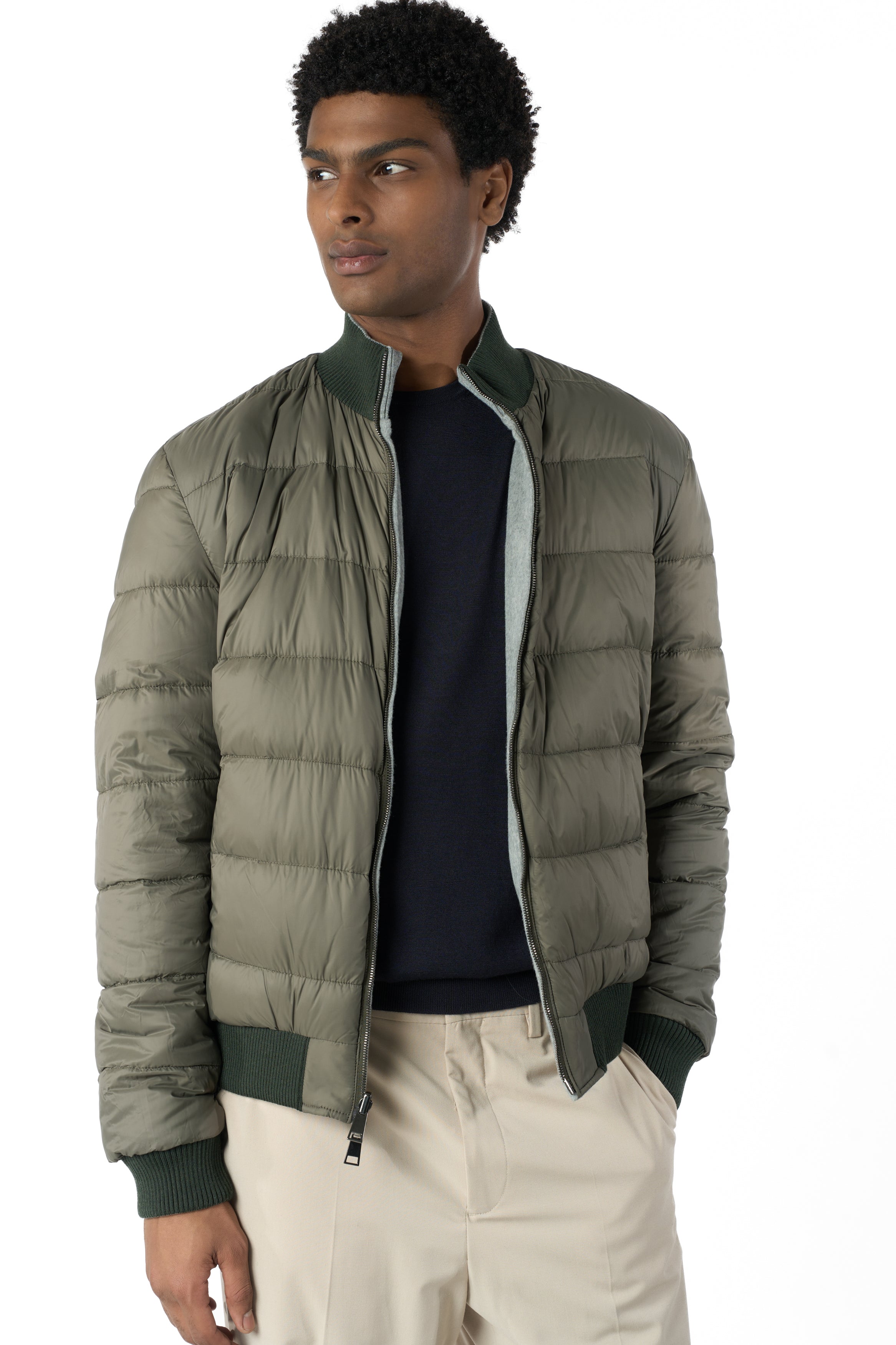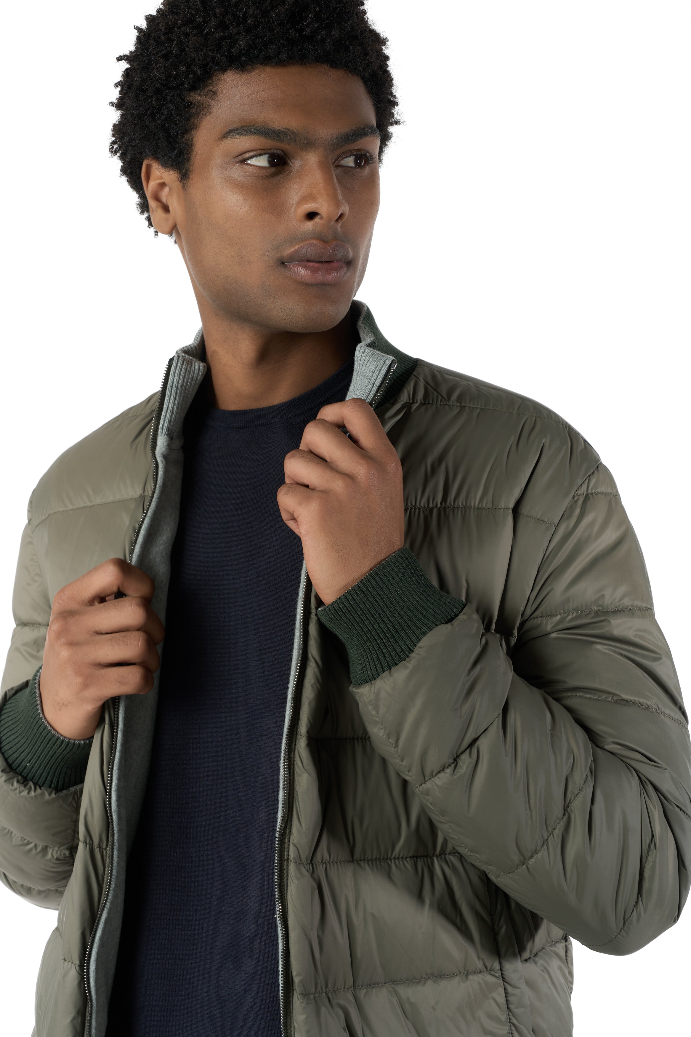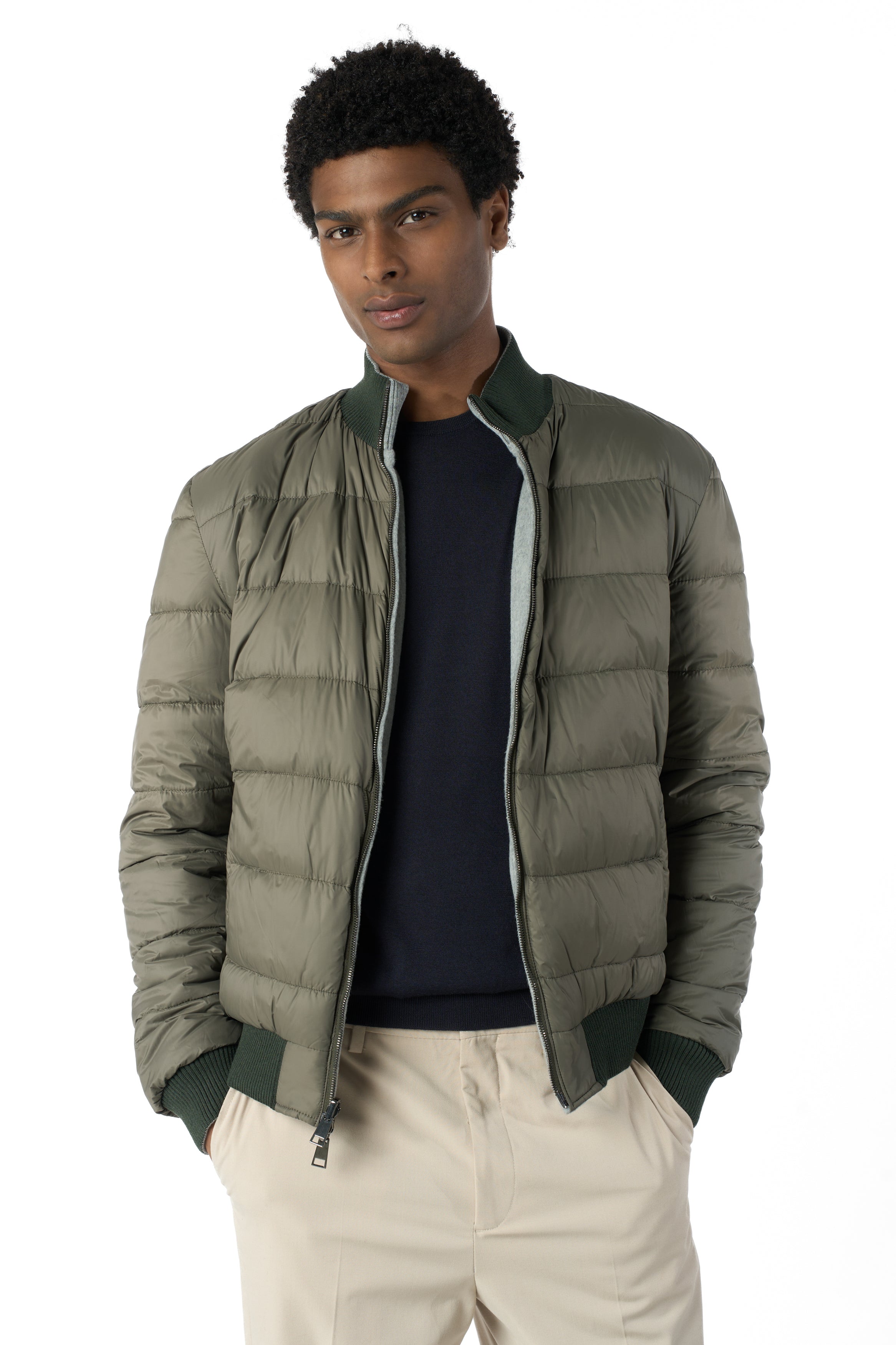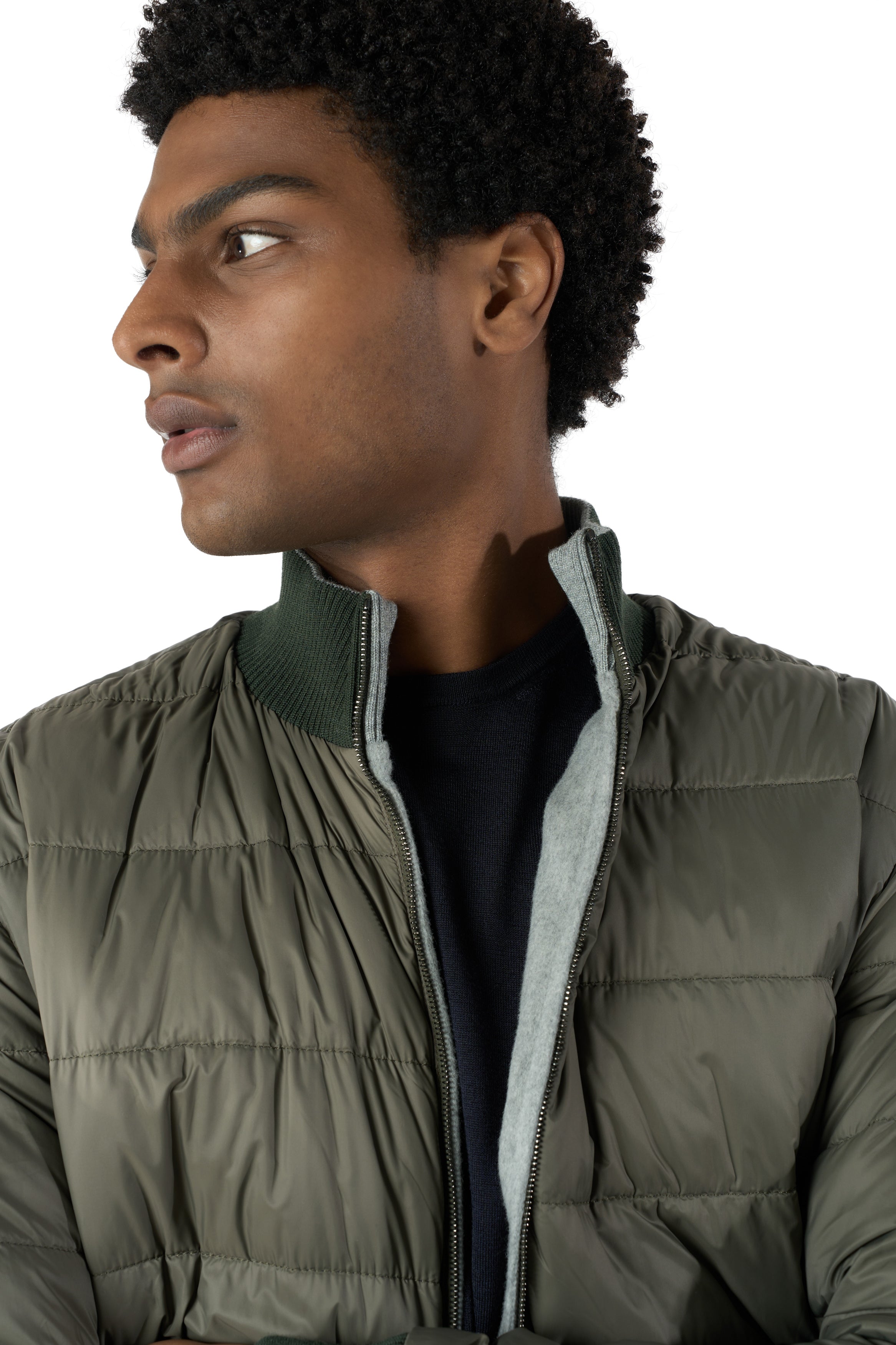 Cashmere-blend bomber jacket, reversible, soft down on the back, central zip, two side pockets.