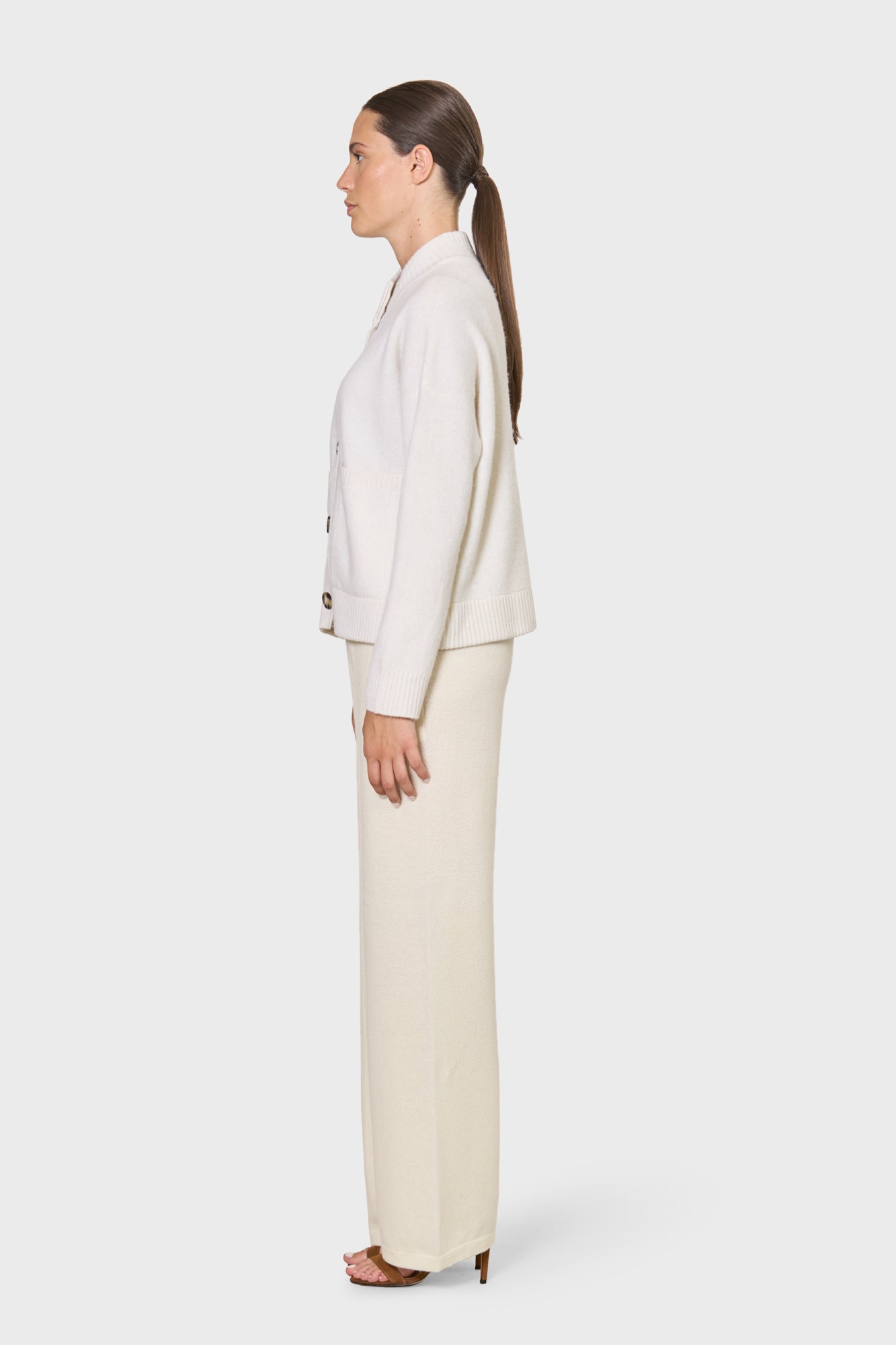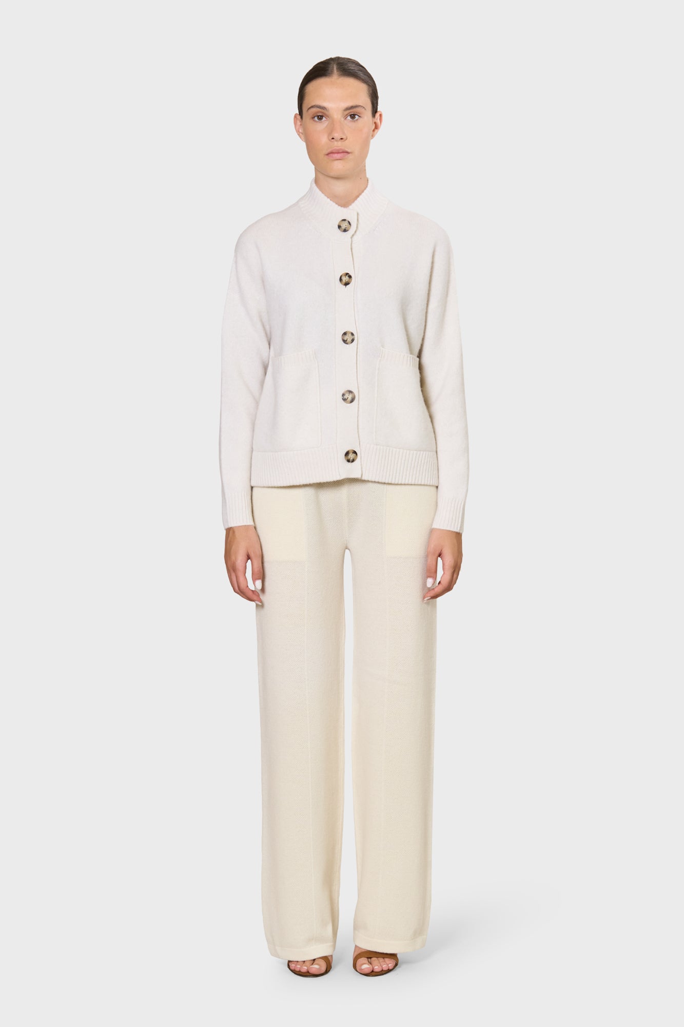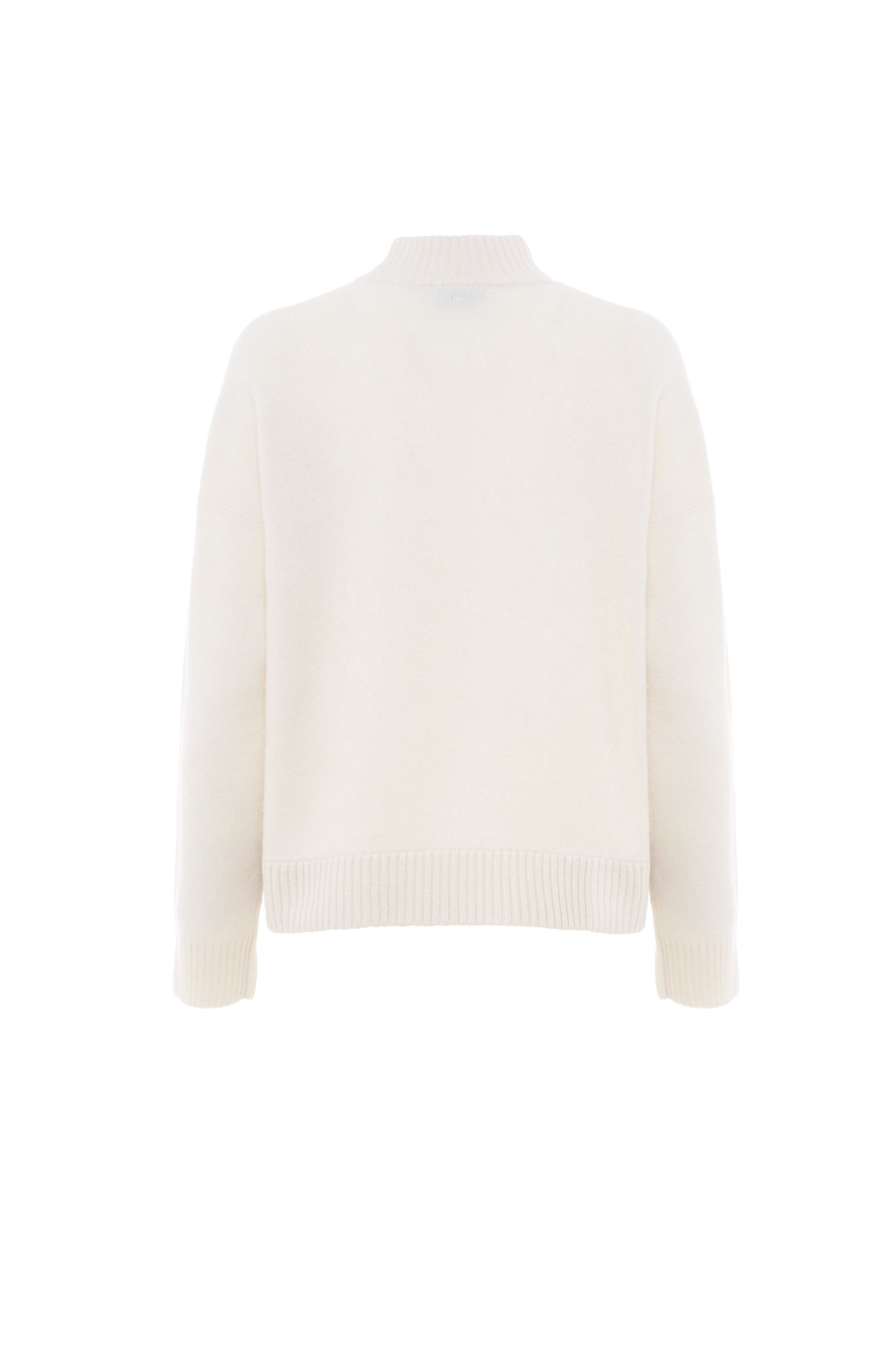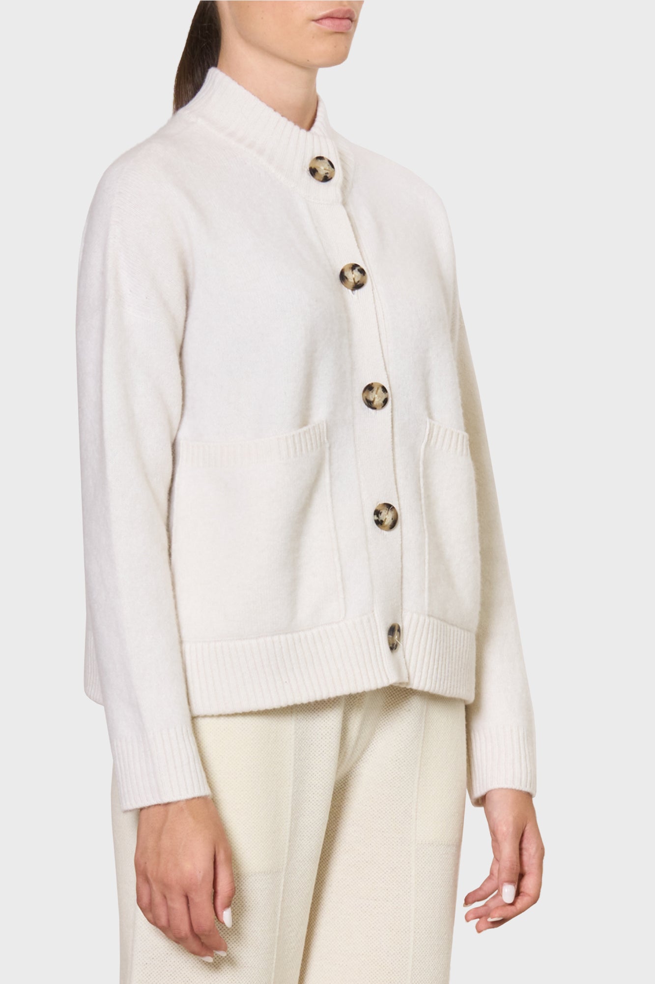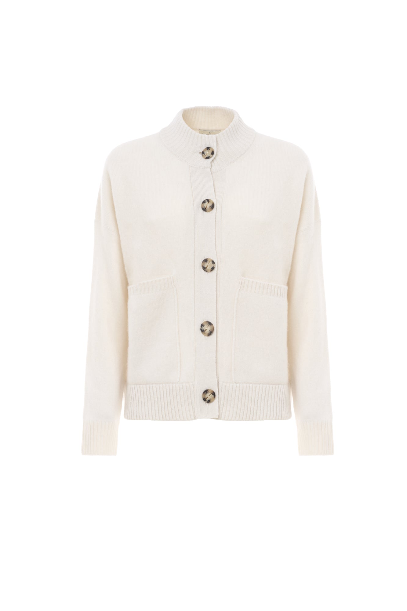 Giacca con collo lupetto di 100% cashmere spazzolato, effetto “peloso” estremamente moderno e morbido, vestibilità sportiva, 2 tasche laterali e 5 bottoni.